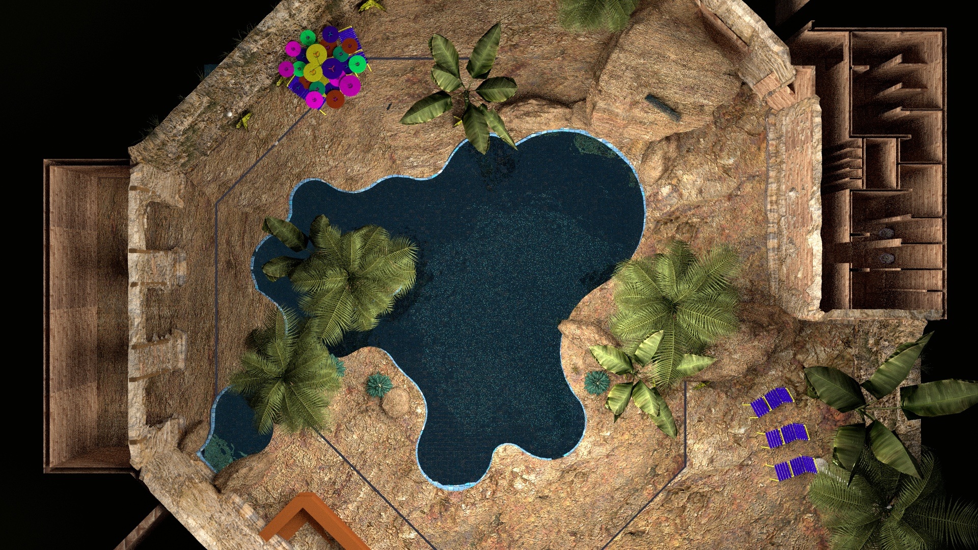 Free image/jpeg, Resolution: 1920x1080, File size: 1.07Mb, visualization of a tropical pool in 3d picture with tags: tropical swimming pool, architecture, architectural 3d rendering, tropical, resort, paradise