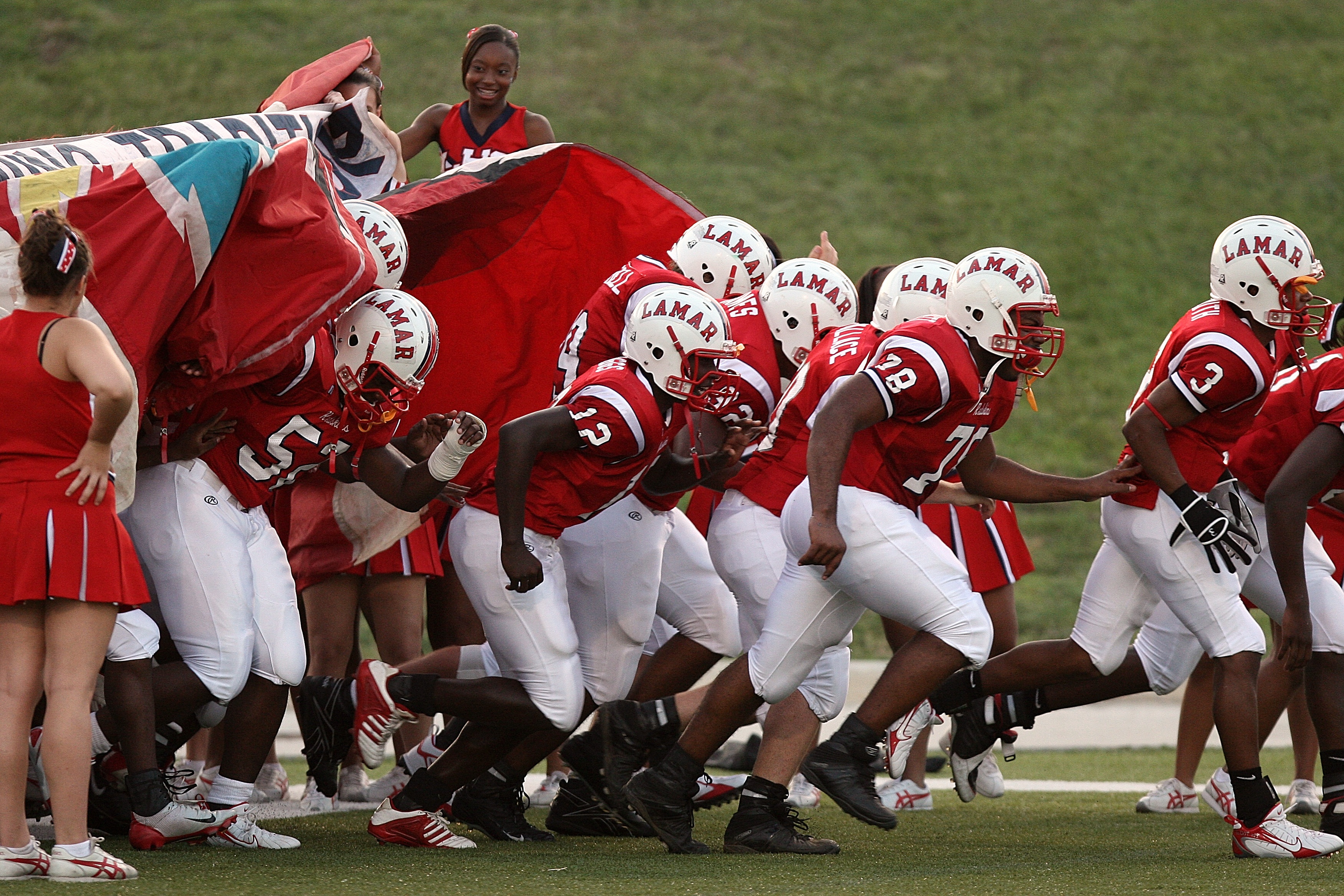 Free image/jpeg, Resolution: 3504x2336, File size: 2.8Mb, football team and cheerleaders picture with tags: pep squad, pre-game, celebration, athletes