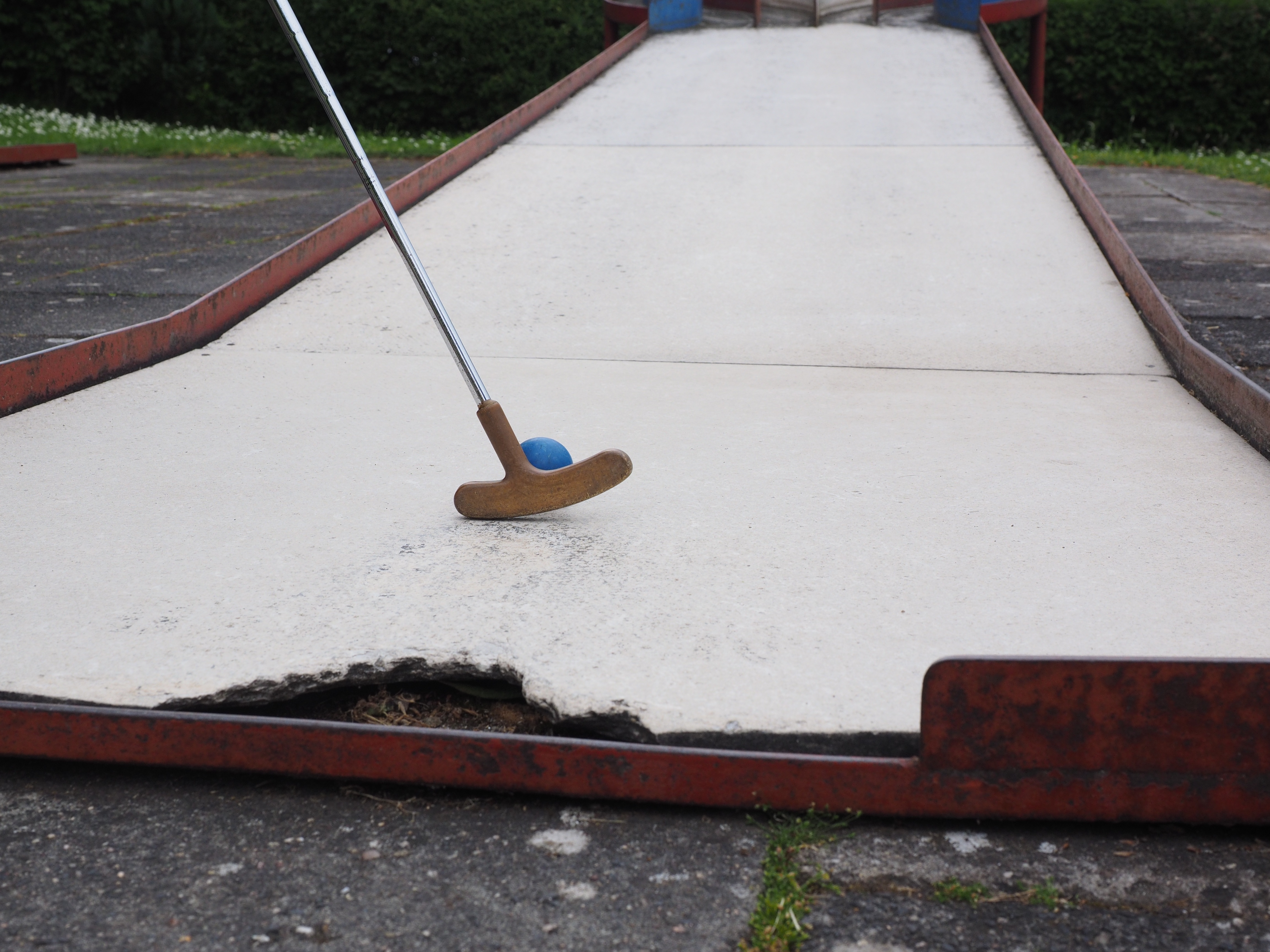 Free image/jpeg, Resolution: 4608x3456, File size: 2.64Mb, mini golf club and ball on ground picture with tags: ball, train, obstacles, eternit track, mini golf, sport, club