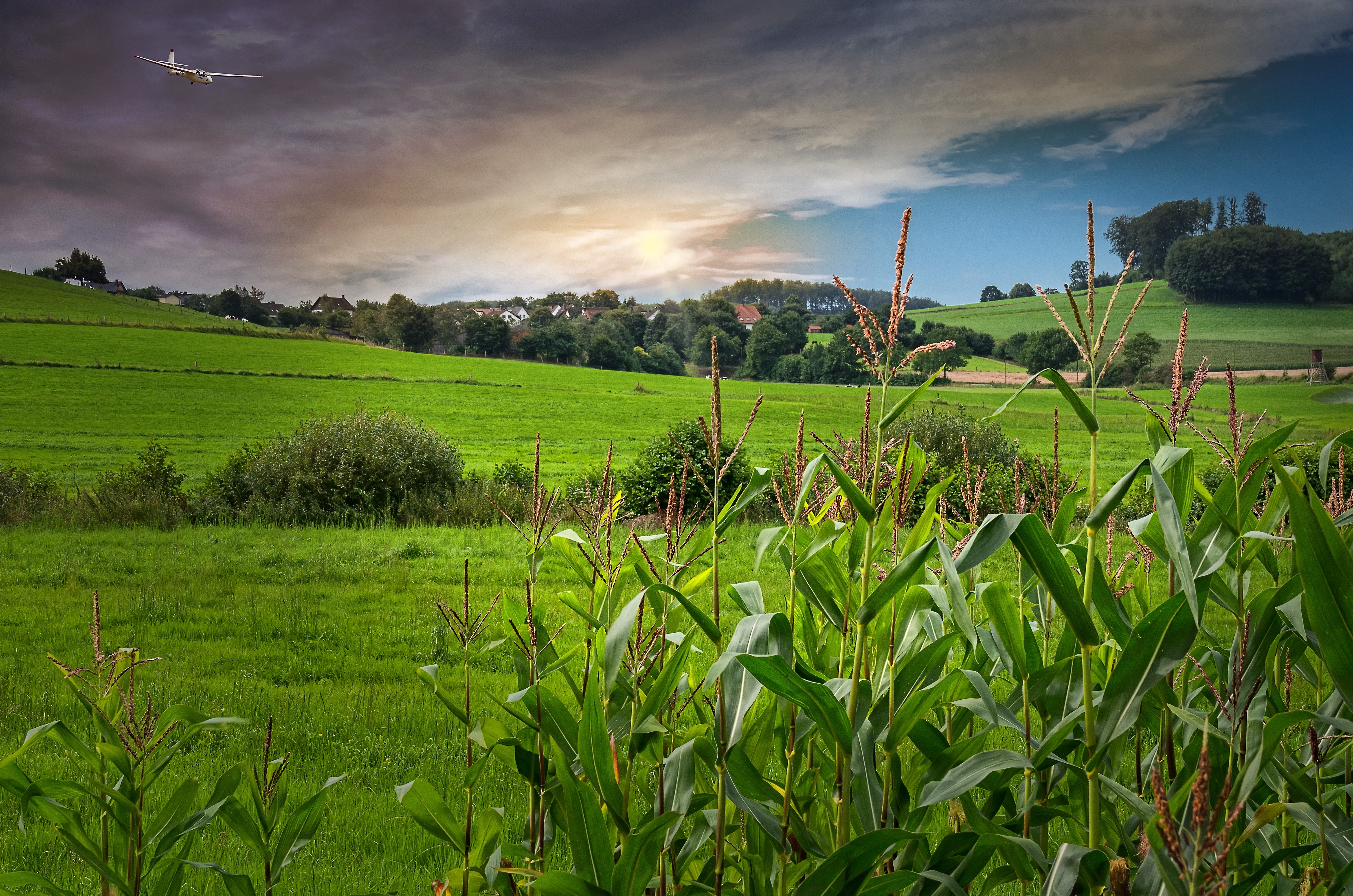 Free image/jpeg, Resolution: 4928x3264, File size: 5.96Mb, green bushes among green fields on the beautiful, colorful landscape picture with tags: landscape, nature, lichtspiel, clouds, meadow, summer, field