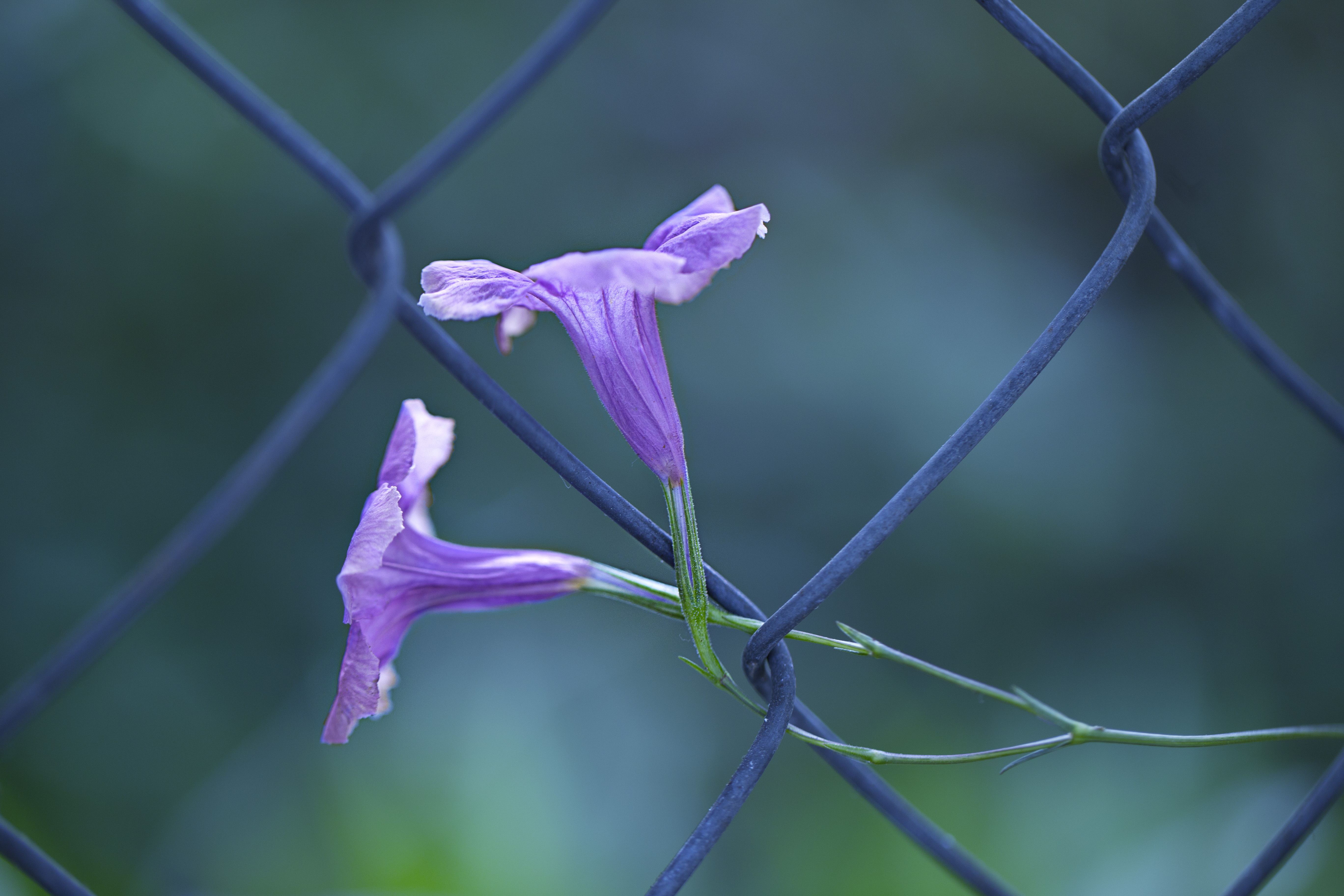 Free image/jpeg, Resolution: 5472x3648, File size: 3.41Mb, mexican petunia, two purple flowers on metal grid picture with tags: flora, nature, ruellia brittoniana, mexican petunia, blossom