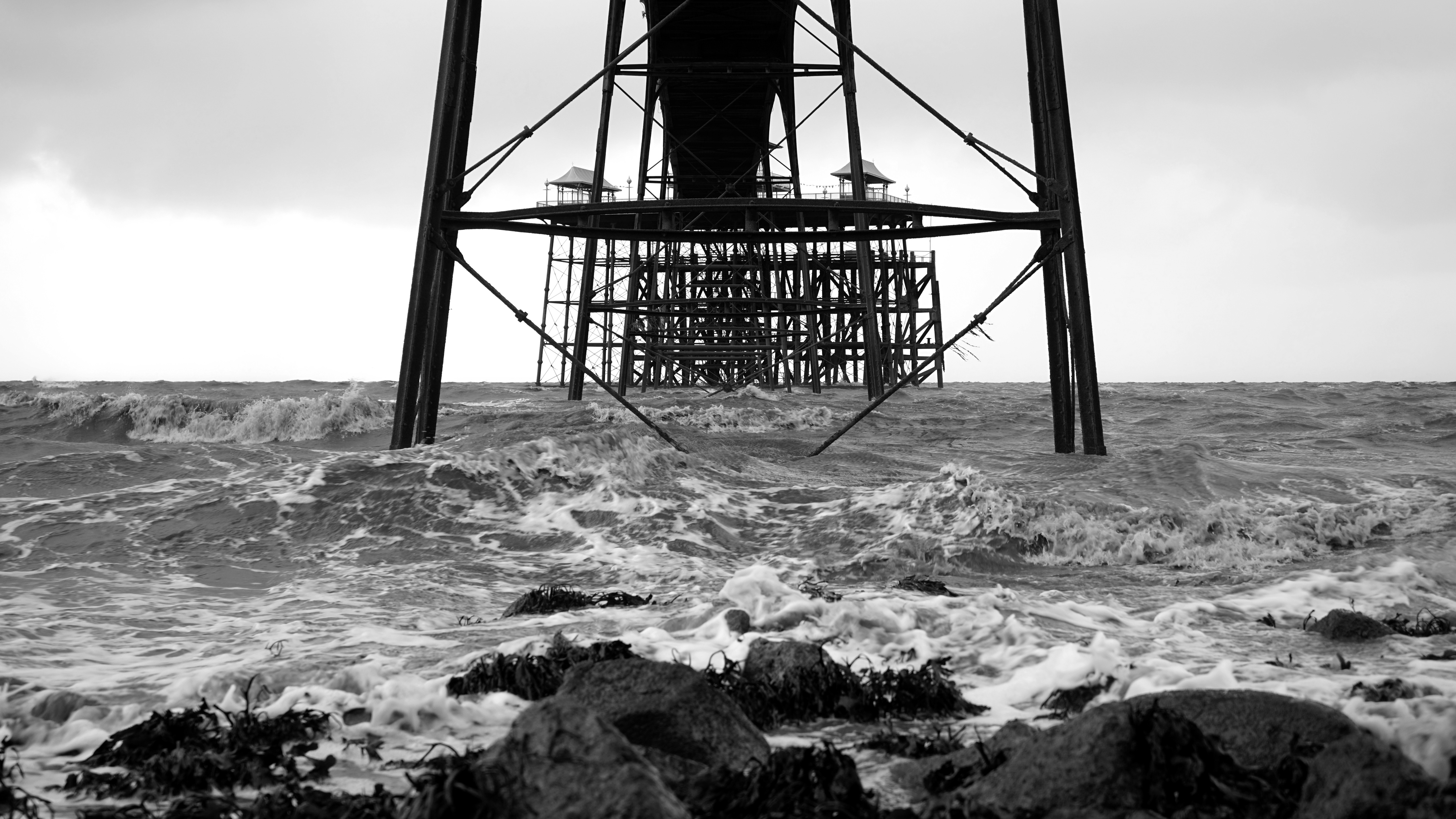 Free image/jpeg, Resolution: 6000x3376, File size: 3.2Mb, Pier in sea at Coast, black and white picture with tags: pier, ocean, coast, water, nature, black and white
