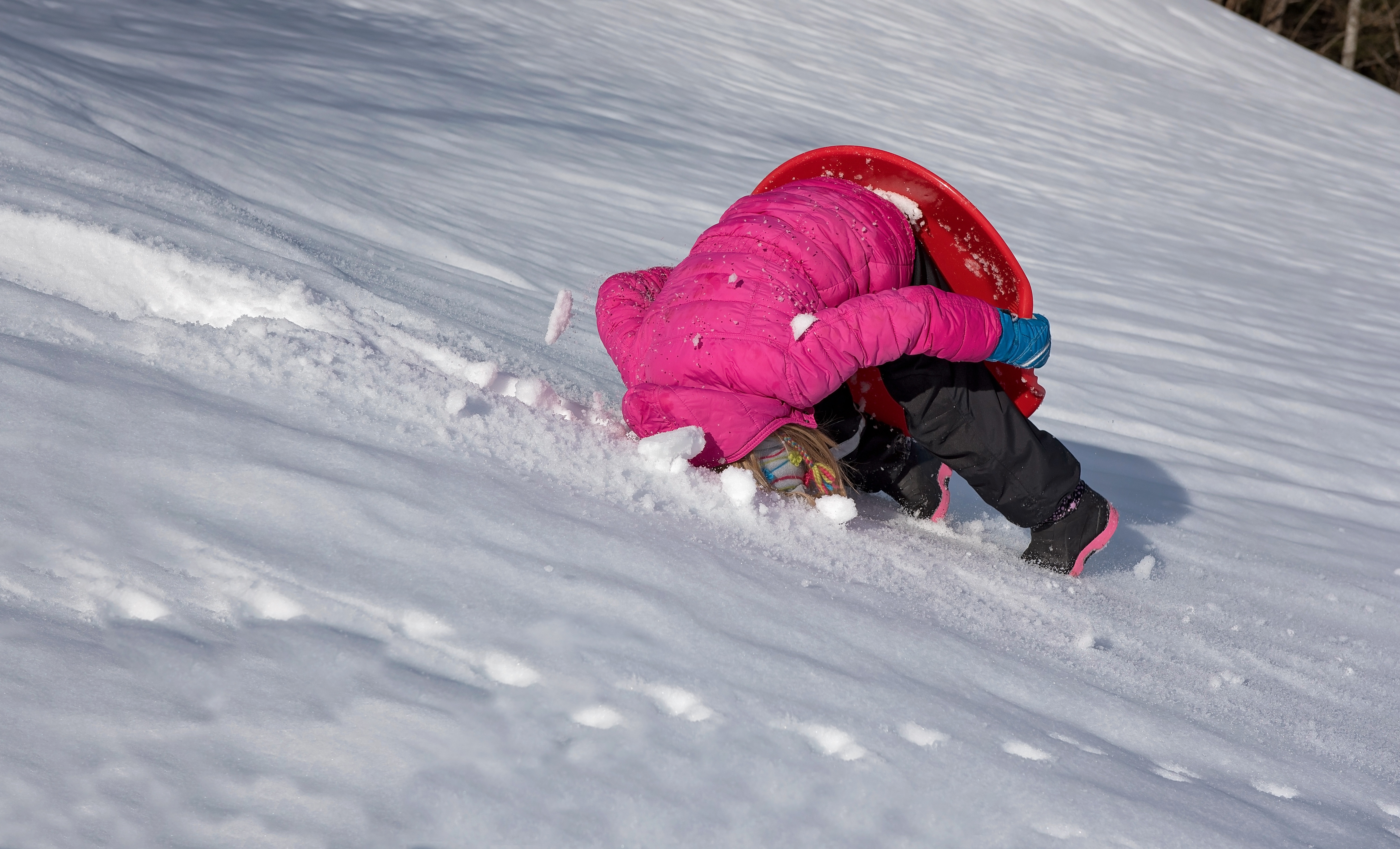 Free image/jpeg, Resolution: 6016x3648, File size: 4.72Mb, Child on the snow picture with tags: child, girl, ride on, winter, snow, downhill, down, somersault