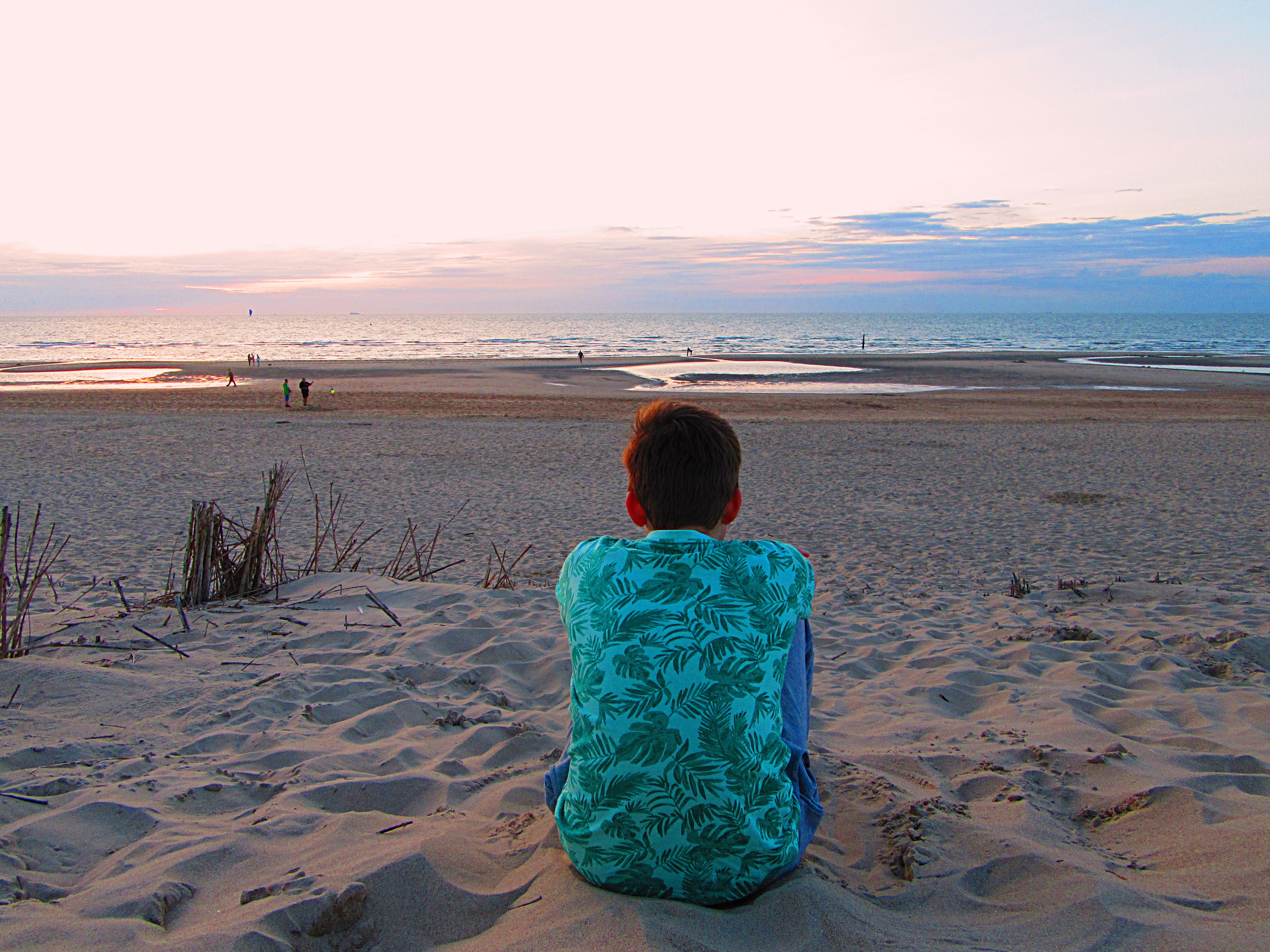 Free image/jpeg, Resolution: 5184x3888, File size: 5.33Mb, young man in a green T-shirt sitting on the beach view from the back picture with tags: teen, waves, beach, summer, sunset, clouds