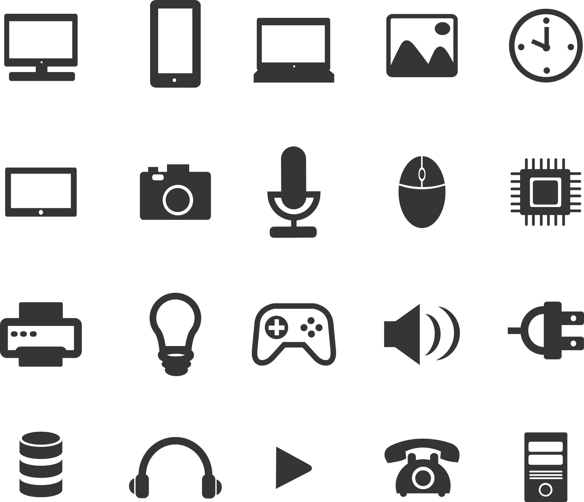 Free image/png, Resolution: 1920x1651, File size: 124Kb, Technologies and Devices, set of black and white icons picture with tags: icons, technology, devices, gadgets, black and white, set