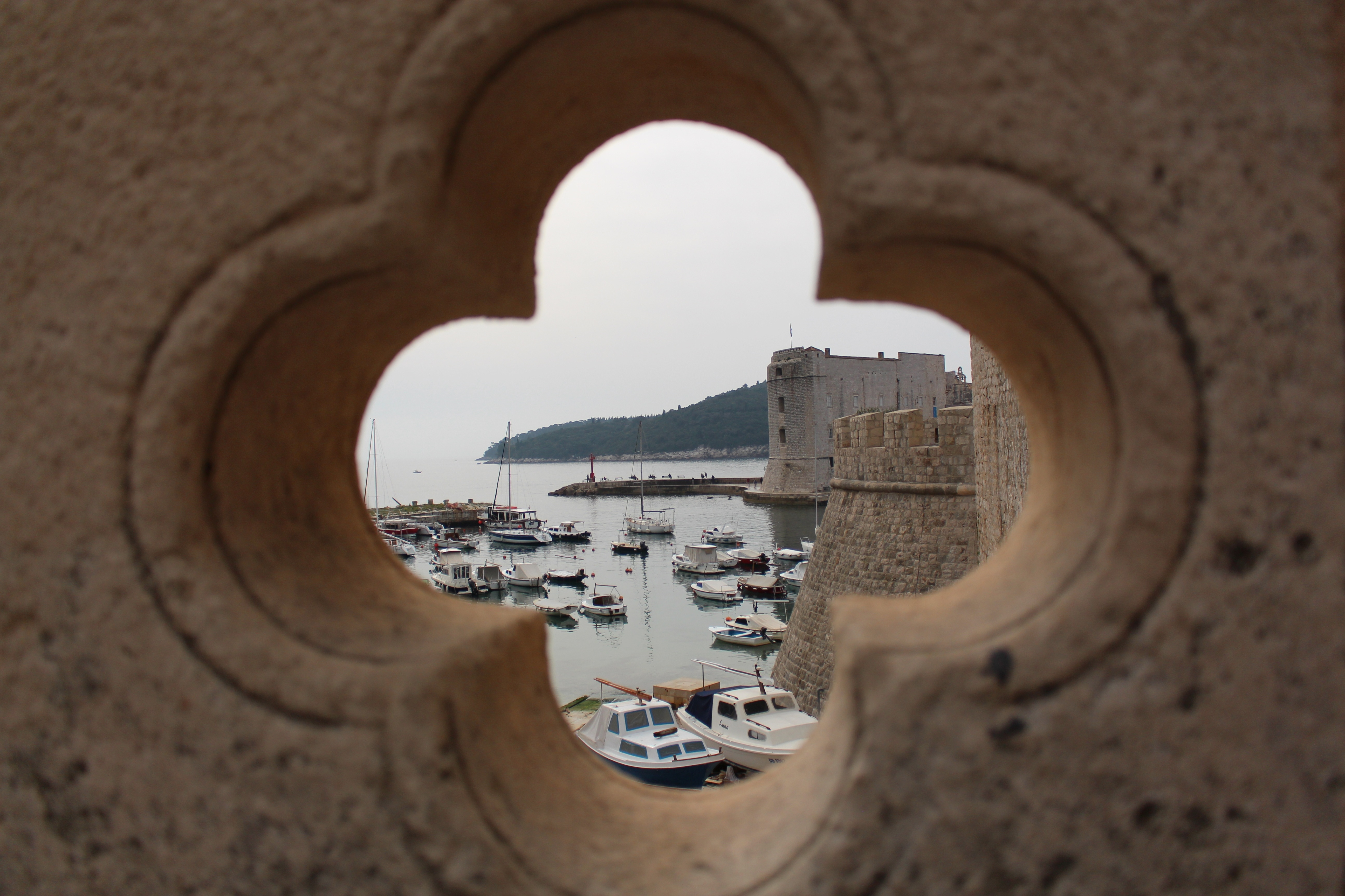 Free image/jpeg, Resolution: 5184x3456, File size: 2.9Mb, view of boats in harbor through Hole in stone Balustrade, croatia, dubrovnik picture with tags: summer holiday, balustrade, hole, port, ships, dubrovnik