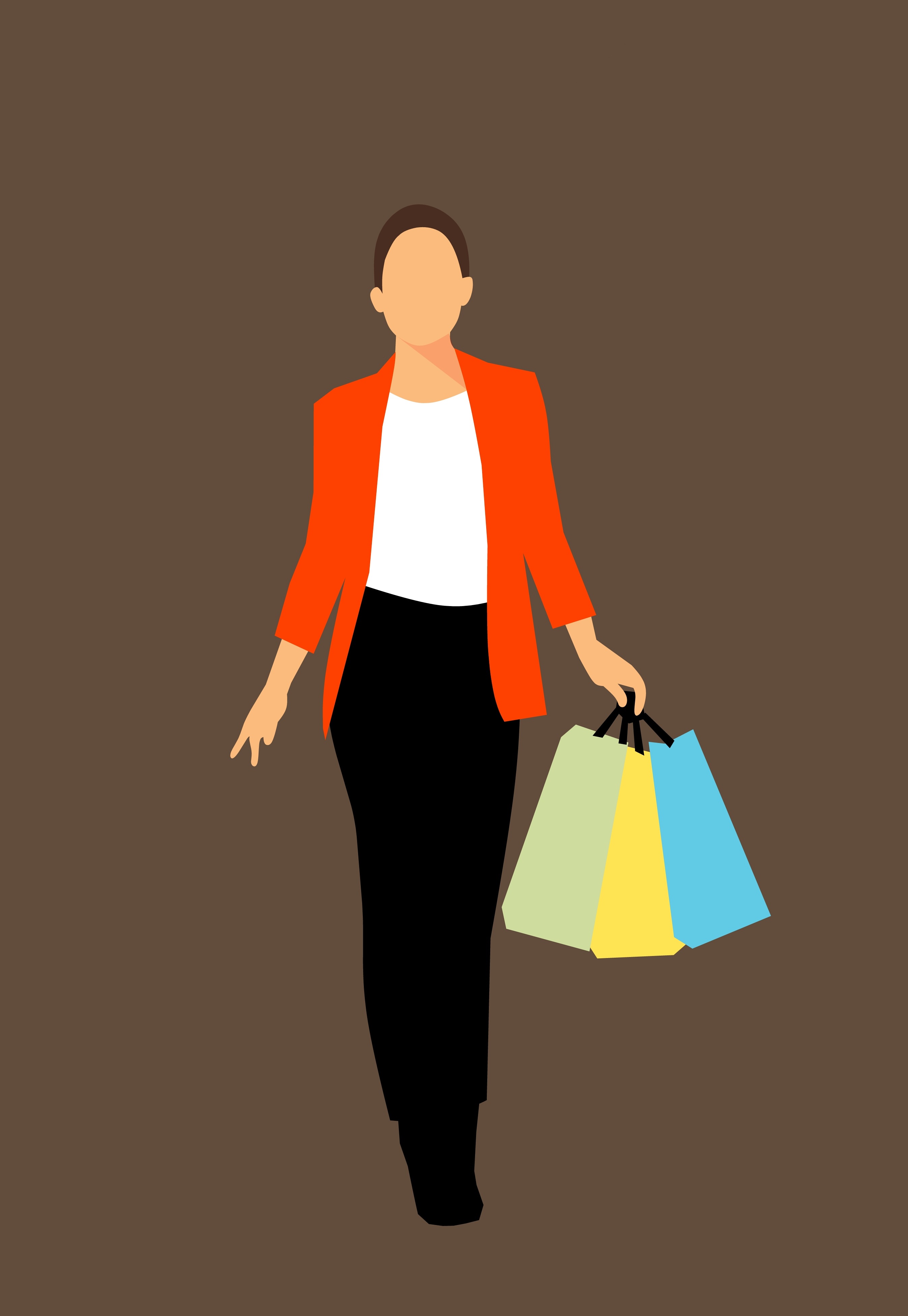 Free image/jpeg, Resolution: 2693x3904, File size: 163Kb, Woman in red jacket, walking with colorful shopping bags, at brown background, clipart picture with tags: shopping, bags, purchasing, walk, woman, colorful, brown background, clipart