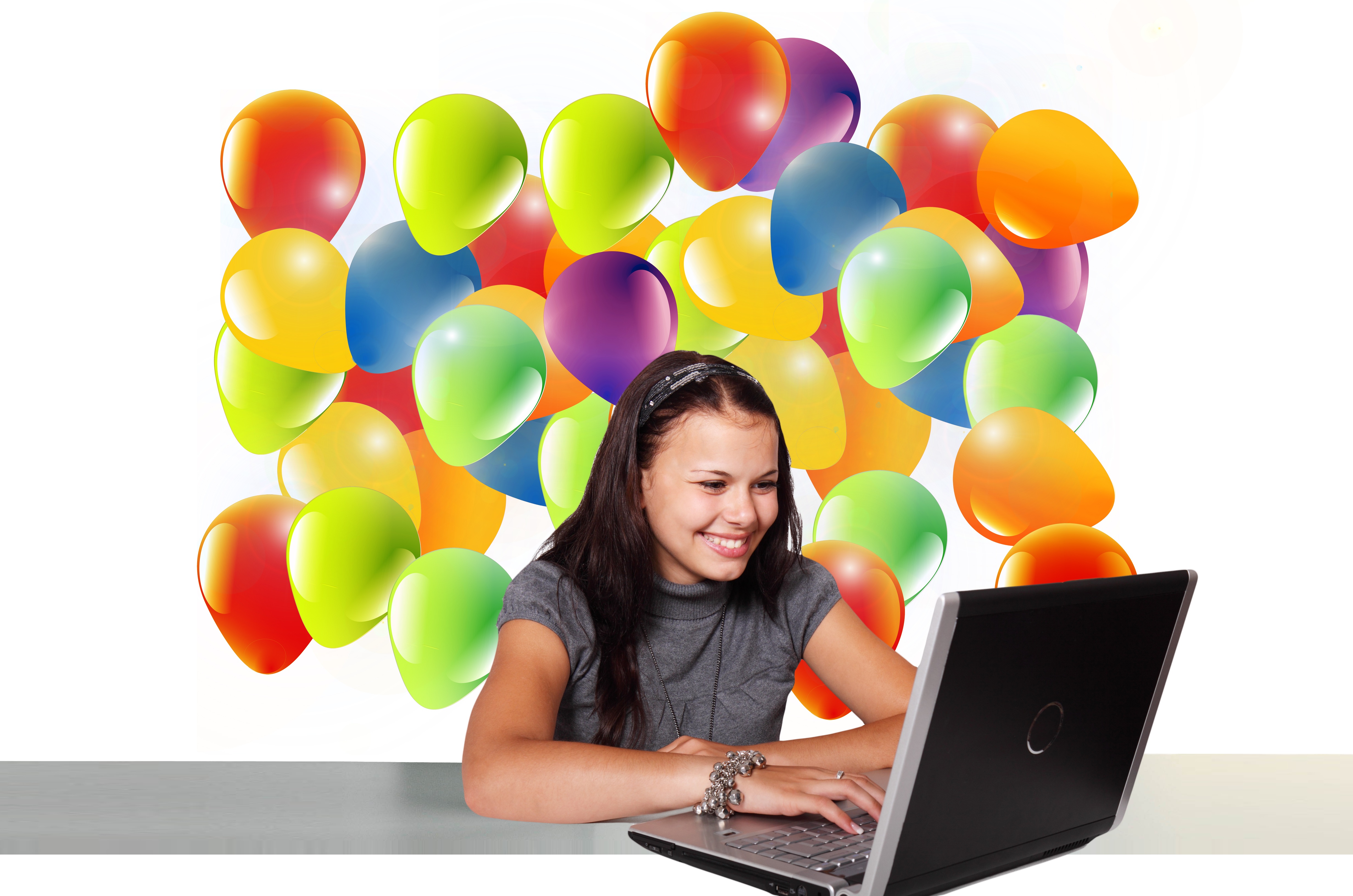 Woman girl joy balloon fun laptop