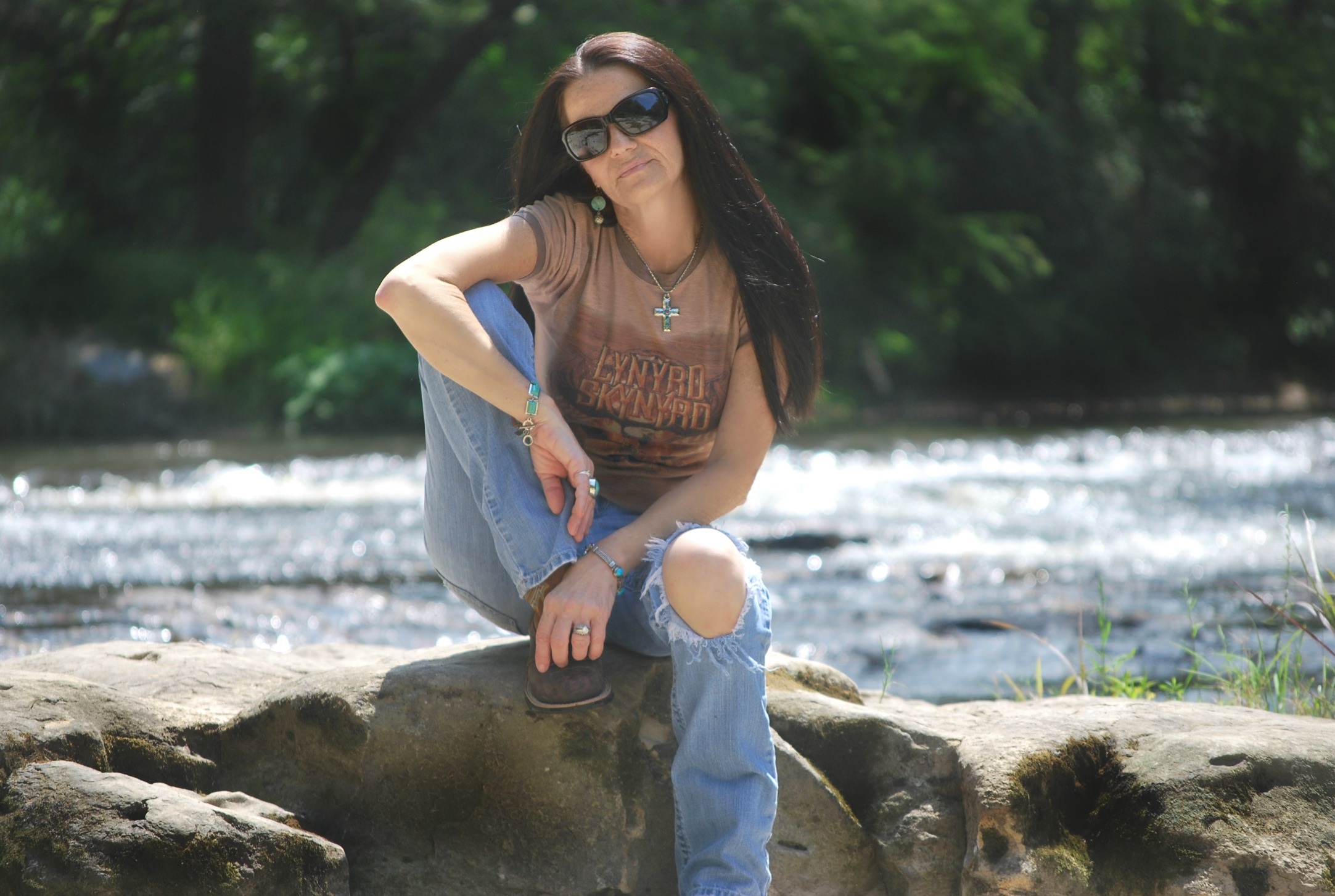 Free image/jpeg, Resolution: 2165x1453, File size: 584Kb, Woman Jeans Goggles picture with tags: woman, jeans, goggles, sitting, rock, pose, water, nature