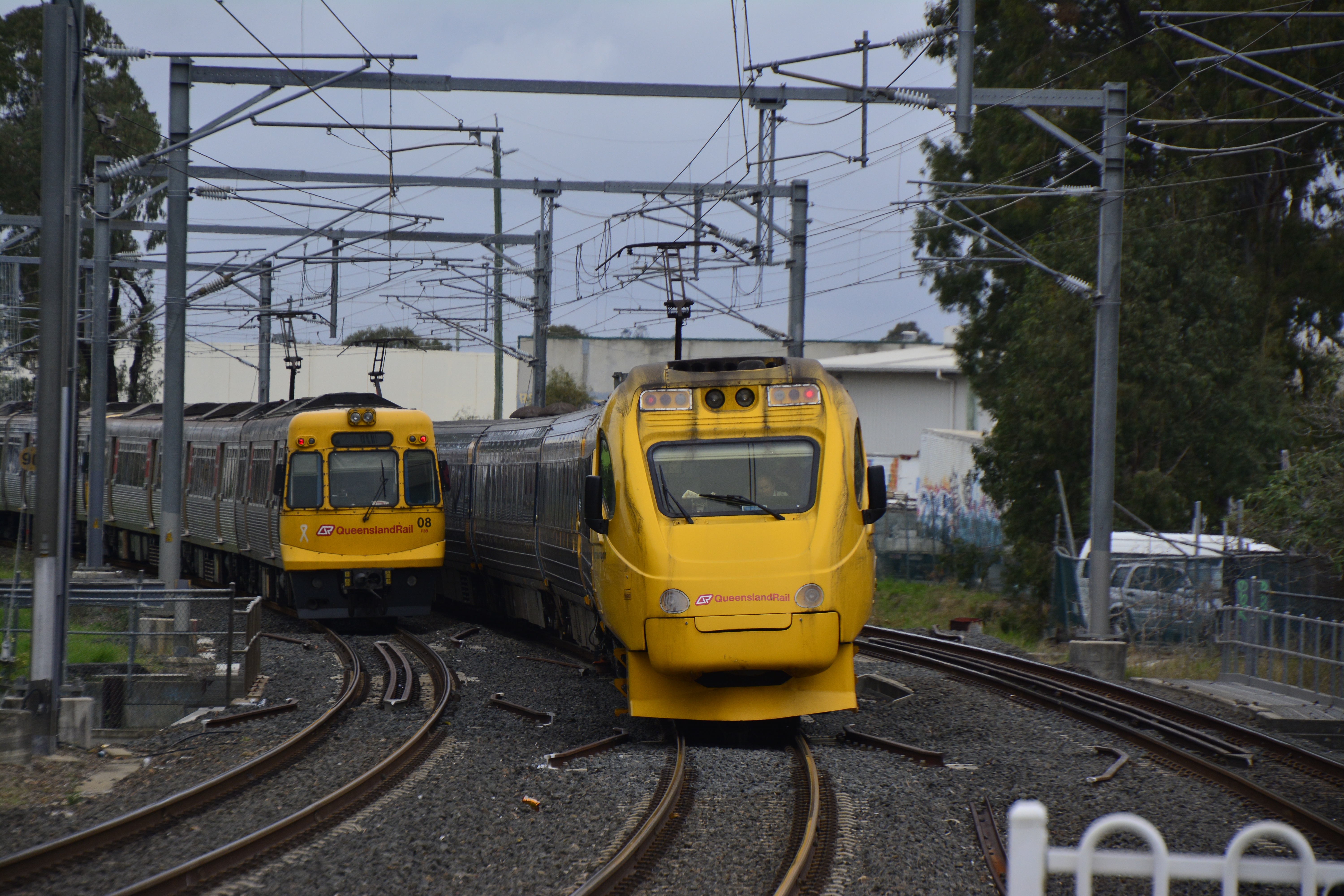 Free image/jpeg, Resolution: 6000x4000, File size: 4.92Mb, two trains with yellow locomotives on rails picture with tags: train, railway, steam, travel, transport, station, rail, locomotive