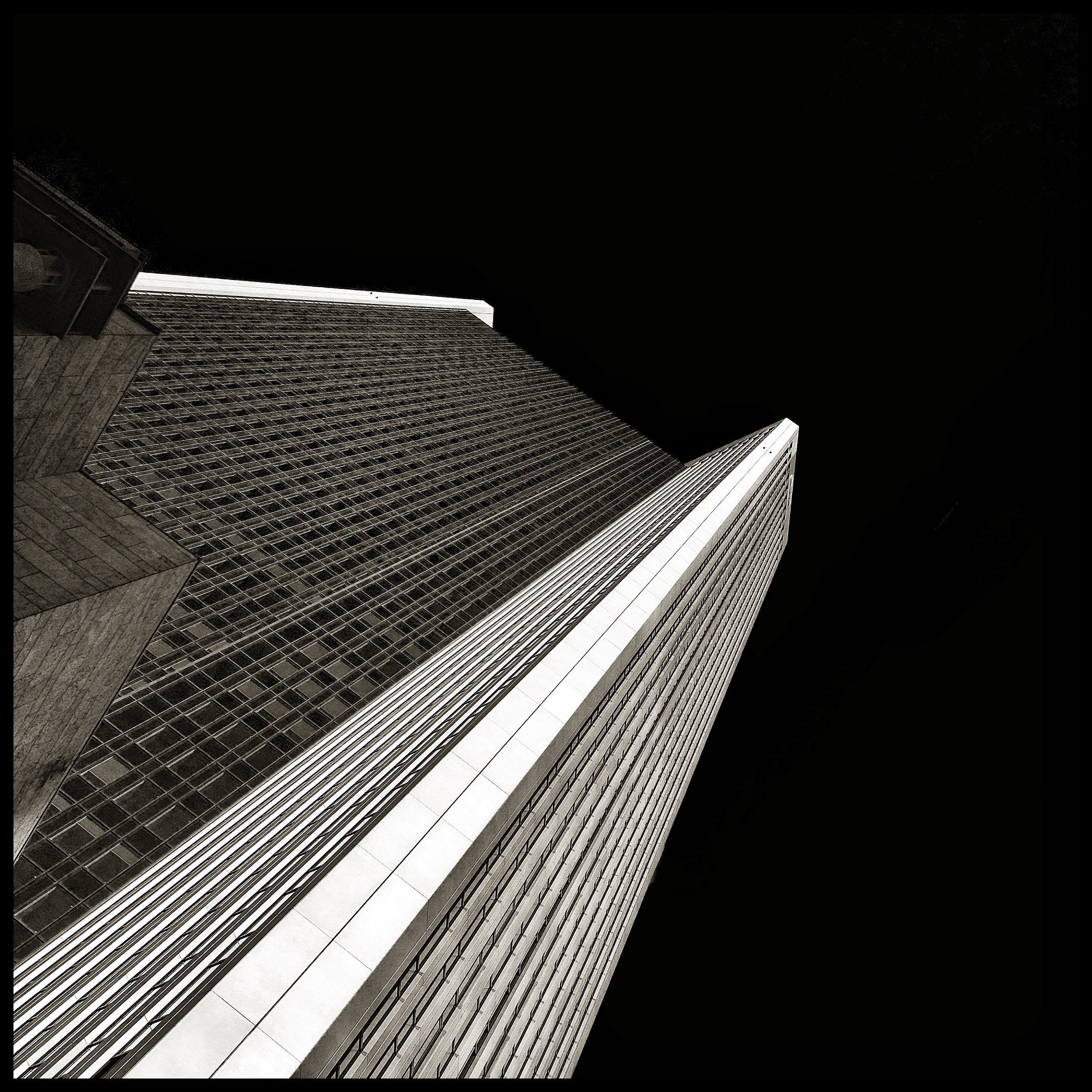 Free image/jpeg, Resolution: 2188x2188, File size: 1.24Mb, Black and white photo with low angle shot of the skyscraper in Frankfurt, Germany, at black background, clipart picture with tags: frankfurt, skyline, building, architecture, skyscraper, low angle shot, black background, clipart