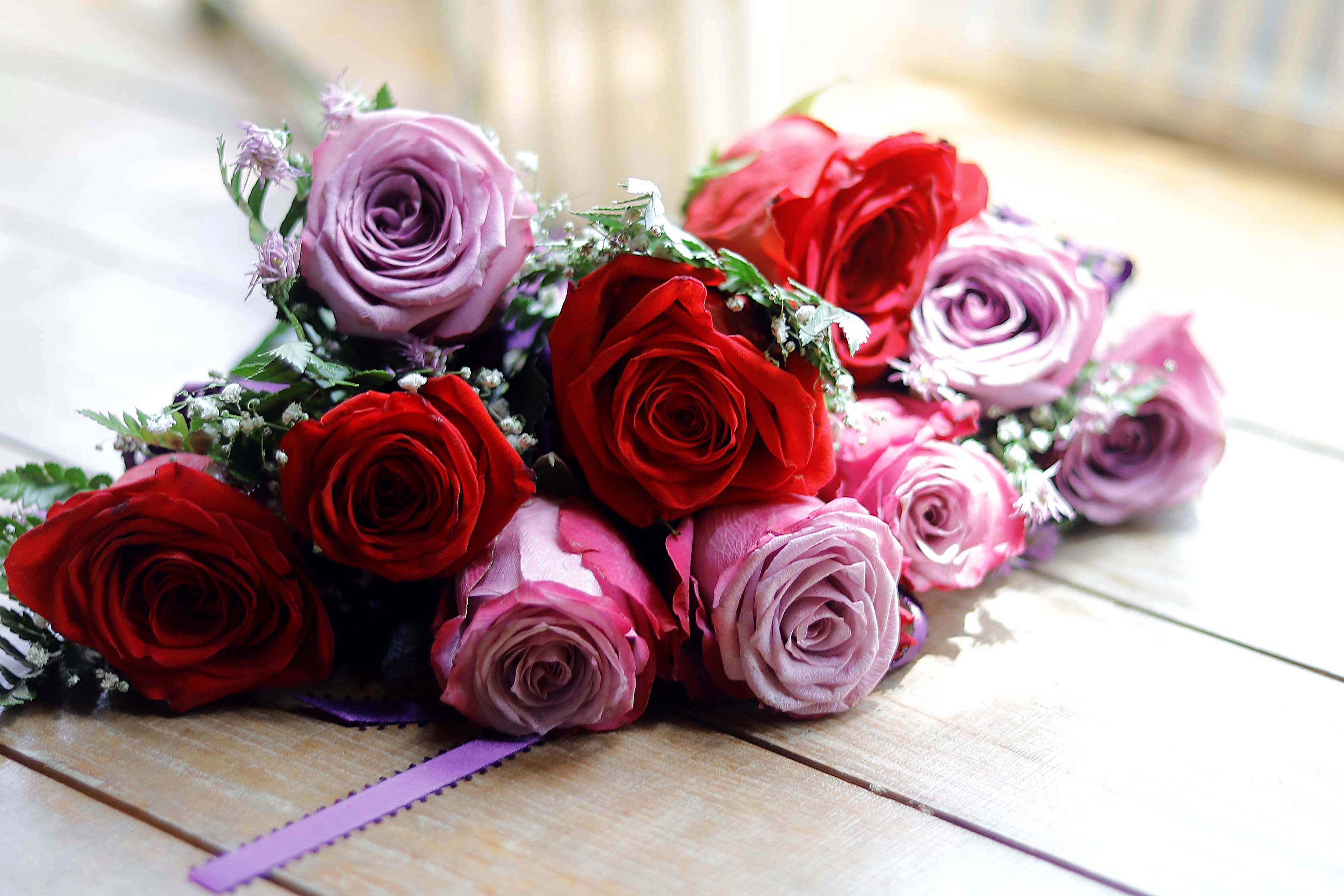 Free image/jpeg, Resolution: 3840x2560, File size: 794Kb, Beautiful bouquet of beautiful red and pink and white rose flowers on wooden surface picture with tags: wedding, rose, red, pink, wedding flowers, bouquet, flowers, beautiful, white, colorful