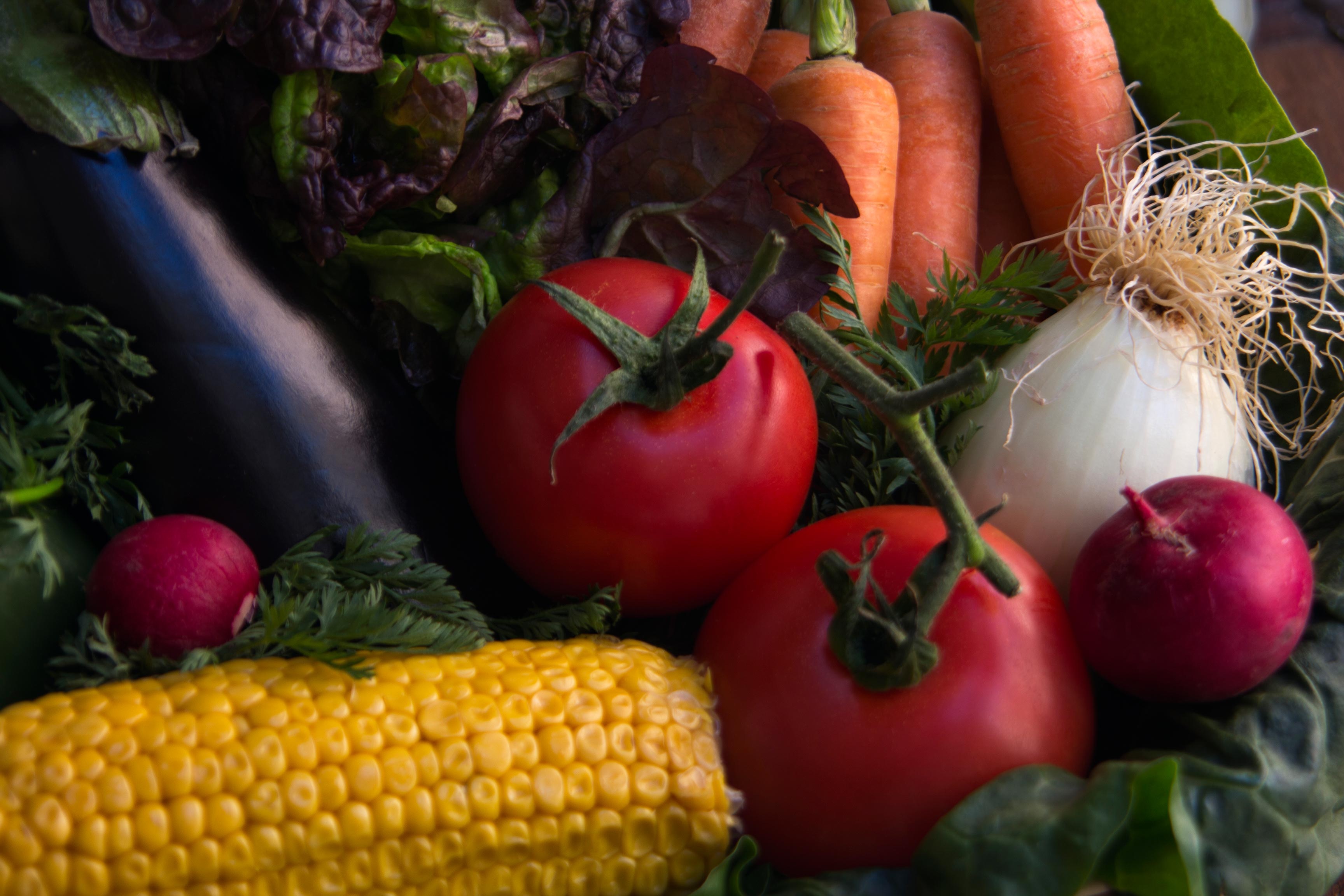 Close-up of the colorful vegetables and greenery
