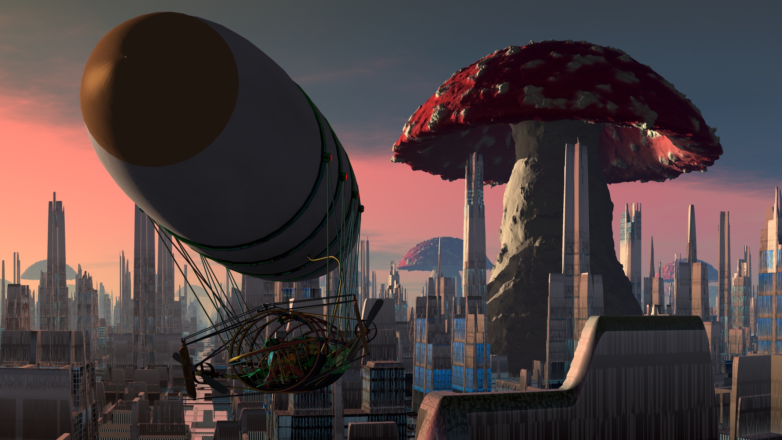 Free image/jpeg, Resolution: 2560x1440, File size: 776Kb, airship city mushroom fantastic sunset picture with tags: airship, city, mushroom, steampunk, fantasy, skyscraper, building, metropolis, fly agaric, flying