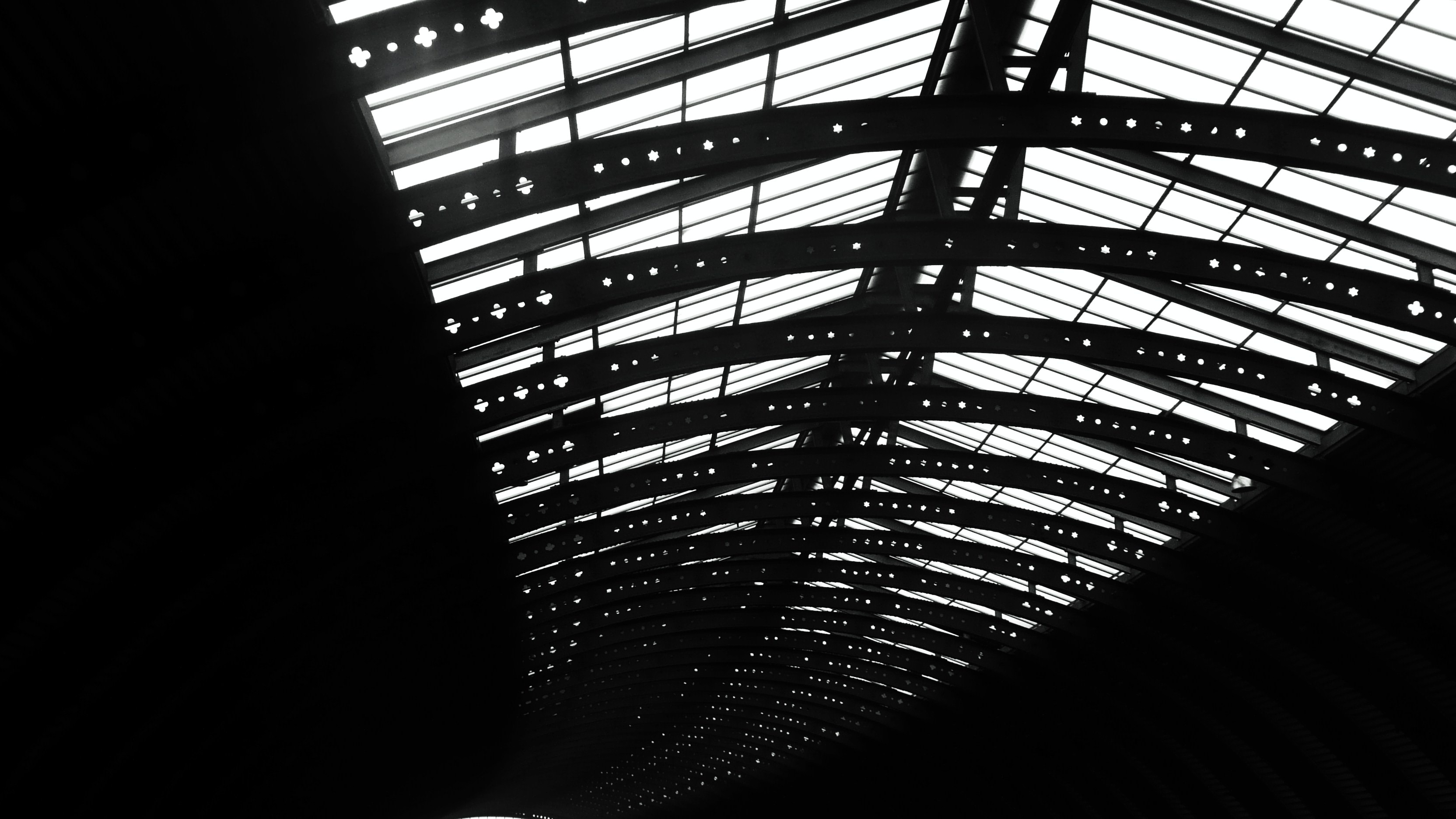 Free image/jpeg, Resolution: 3328x1872, File size: 701Kb, Black and white photo of the construction with the iron roof, with the glass, with light picture with tags: roof, iron, glass, construction, steel, structure, black and white, light, darkness