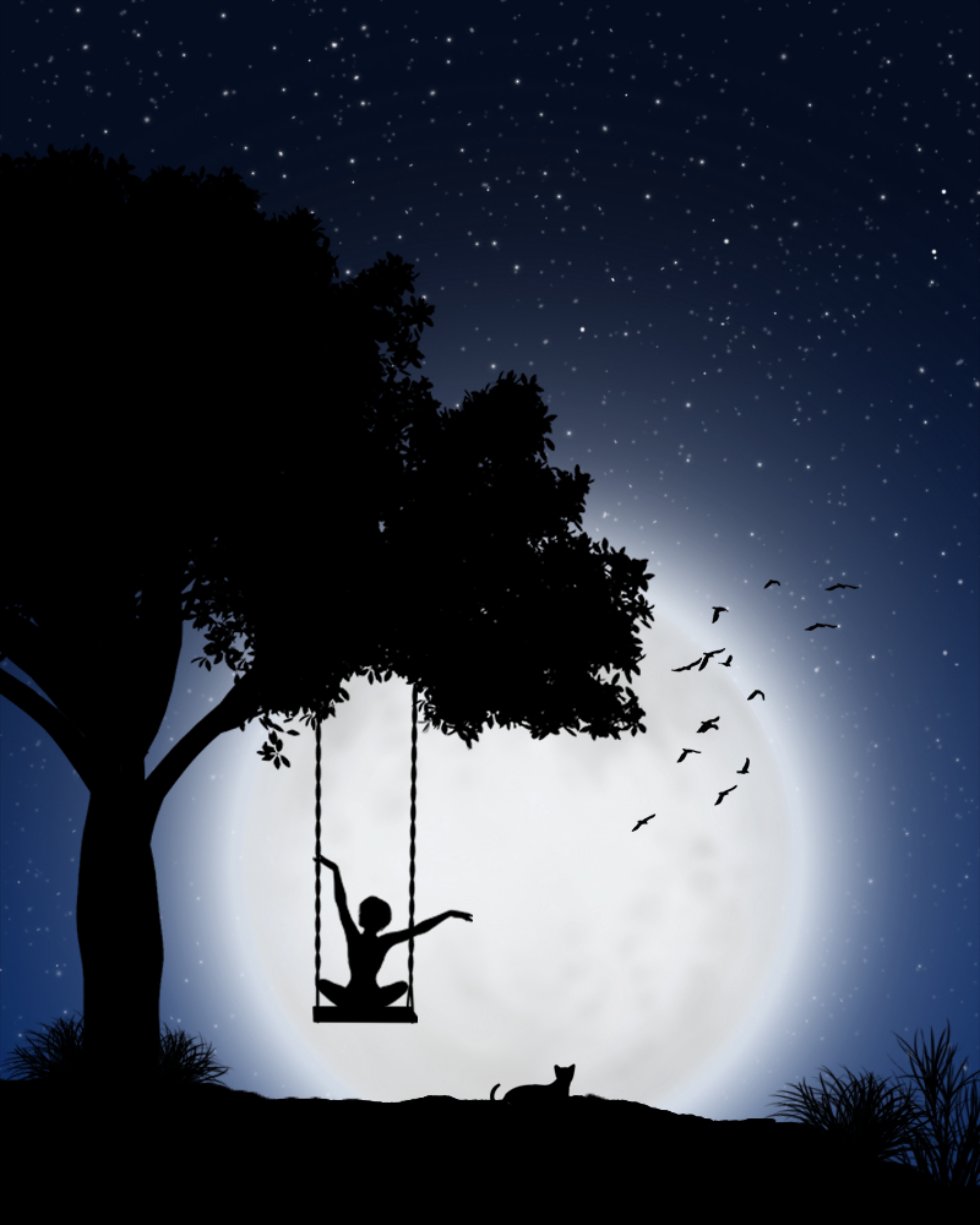 Free image/jpeg, Resolution: 4385x5481, File size: 1.05Mb, moon silhouette tree birds drawing picture with tags: moon, silhouette, tree, birds, swing