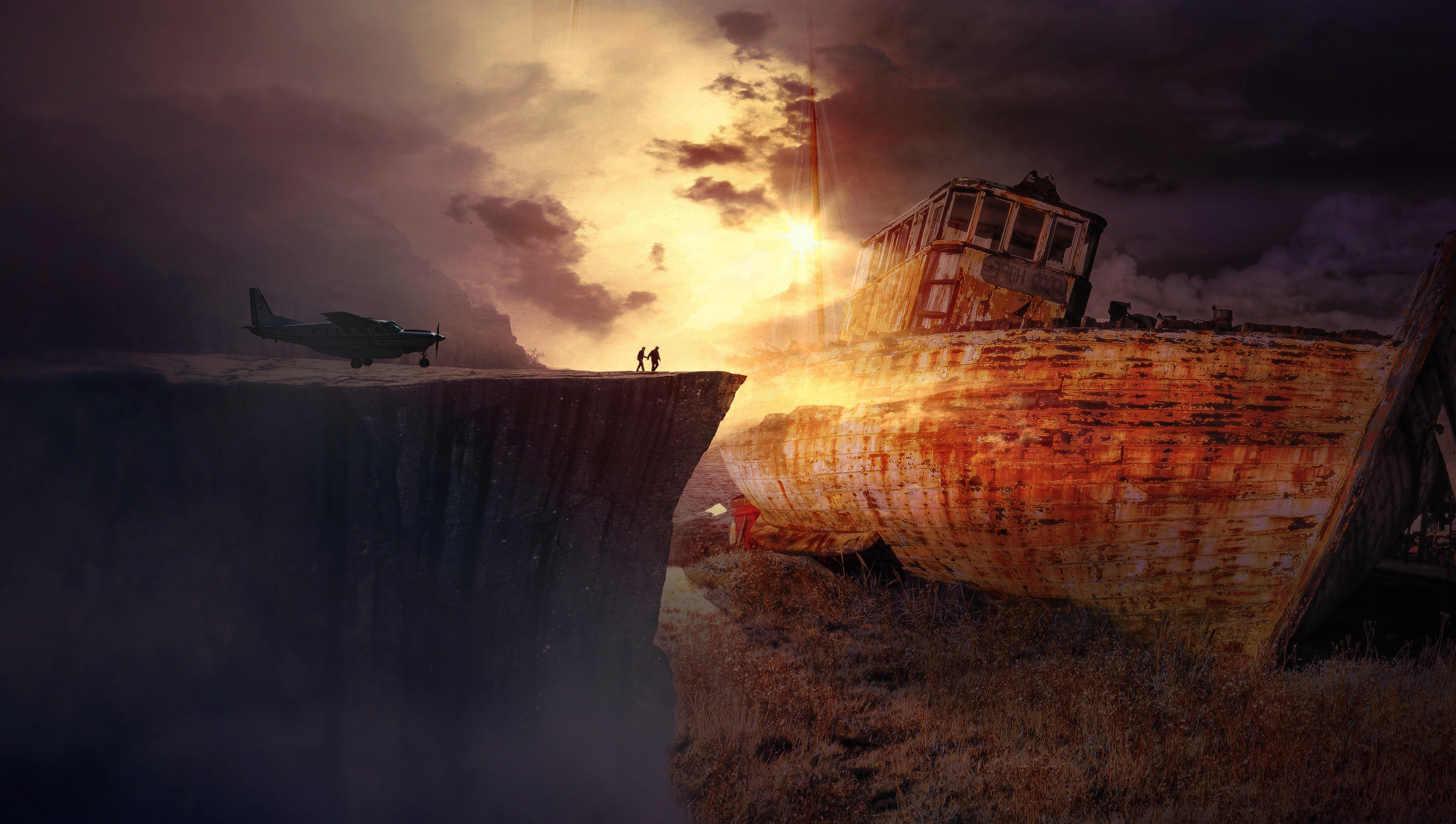 Free image/jpeg, Resolution: 5000x2830, File size: 2.99Mb, people and plane on a rock, rusty ship after a crash picture with tags: night, light, people, plane, rock, rusty, ship, crash