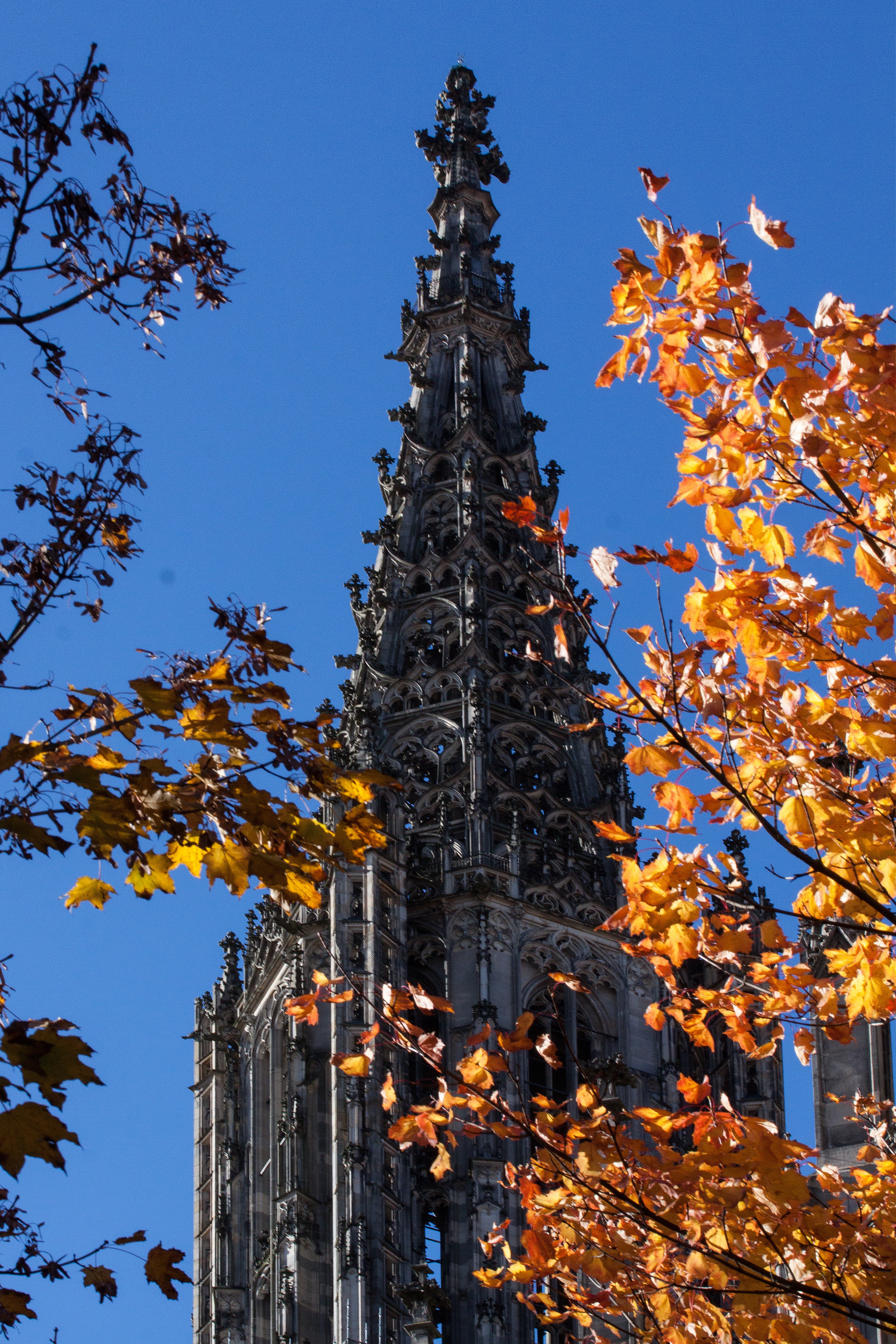 Free image/jpeg, Resolution: 3168x4752, File size: 5.83Mb, autumn trees and spire of Ulm Cathedral picture with tags: ulm cathedral, architecture, building, church, main tower, autumn
