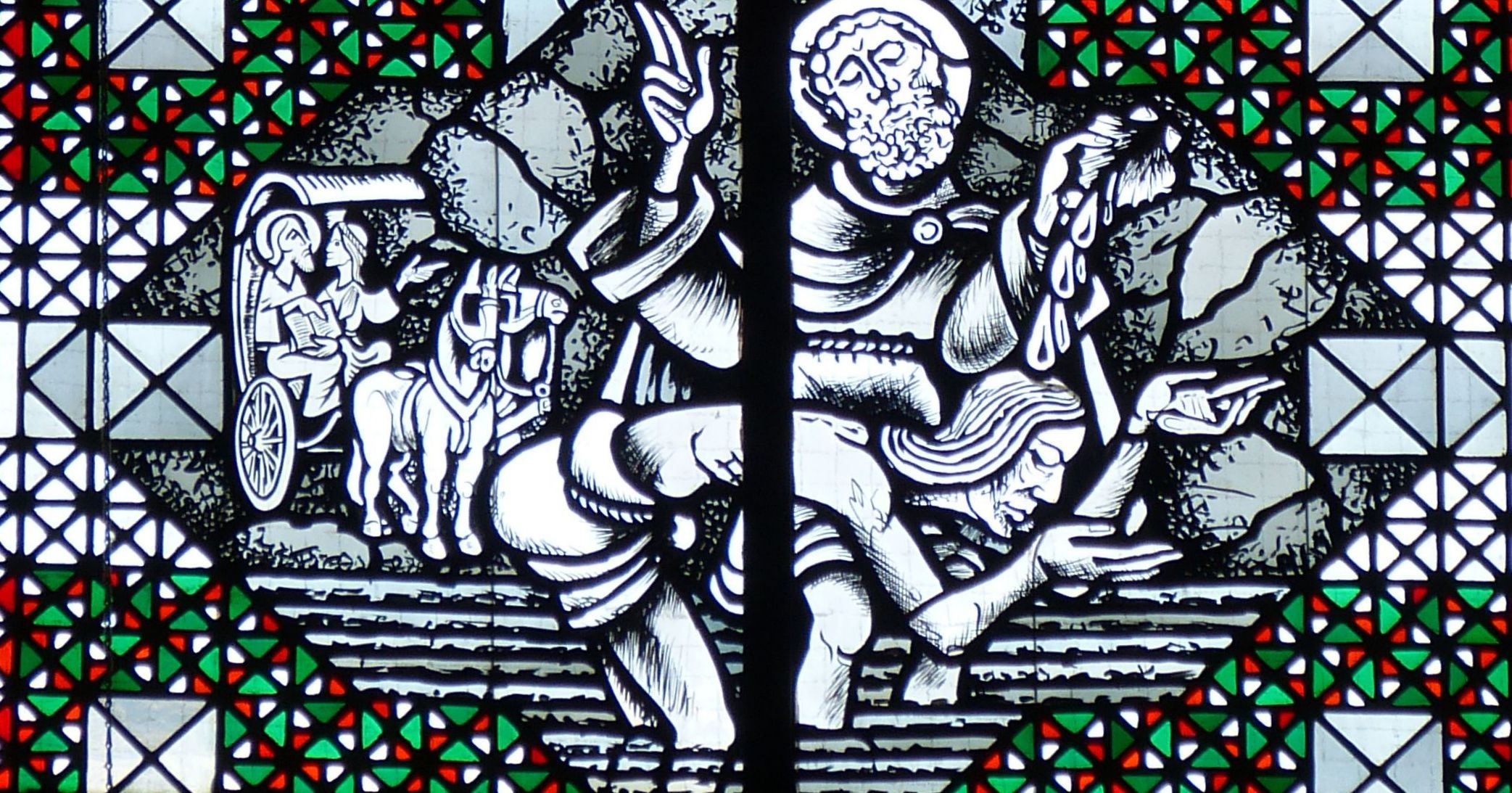 Free image/jpeg, Resolution: 2085x1093, File size: 648Kb, black and white image of bible drawing on stained glass window picture with tags: church, window, image, bible, christianity, faith, gospel