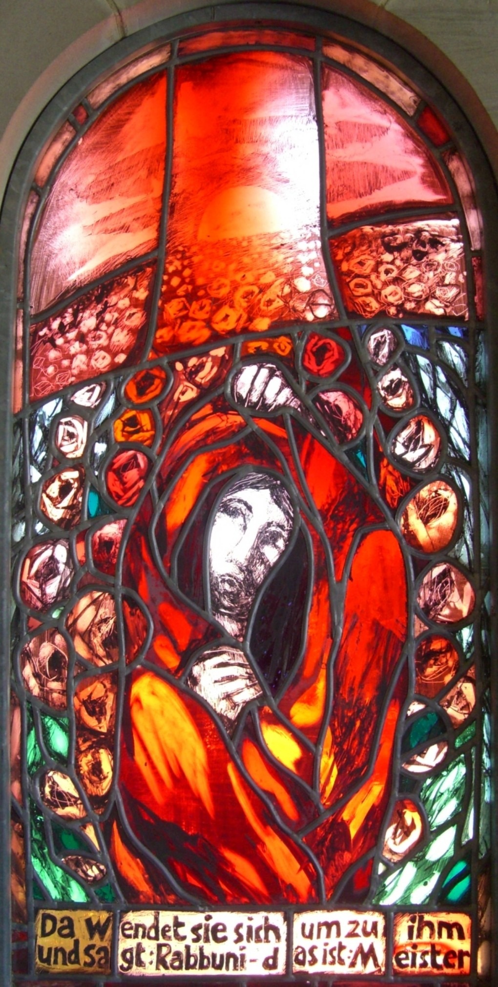 Free image/jpeg, Resolution: 1020x2021, File size: 537Kb, red stained glass window in the funeral hall at Cathedral Of St James, Hohenberg, Ostalb picture with tags: glass window, funeral hall, church of hohenberg, ostalb, stained, red