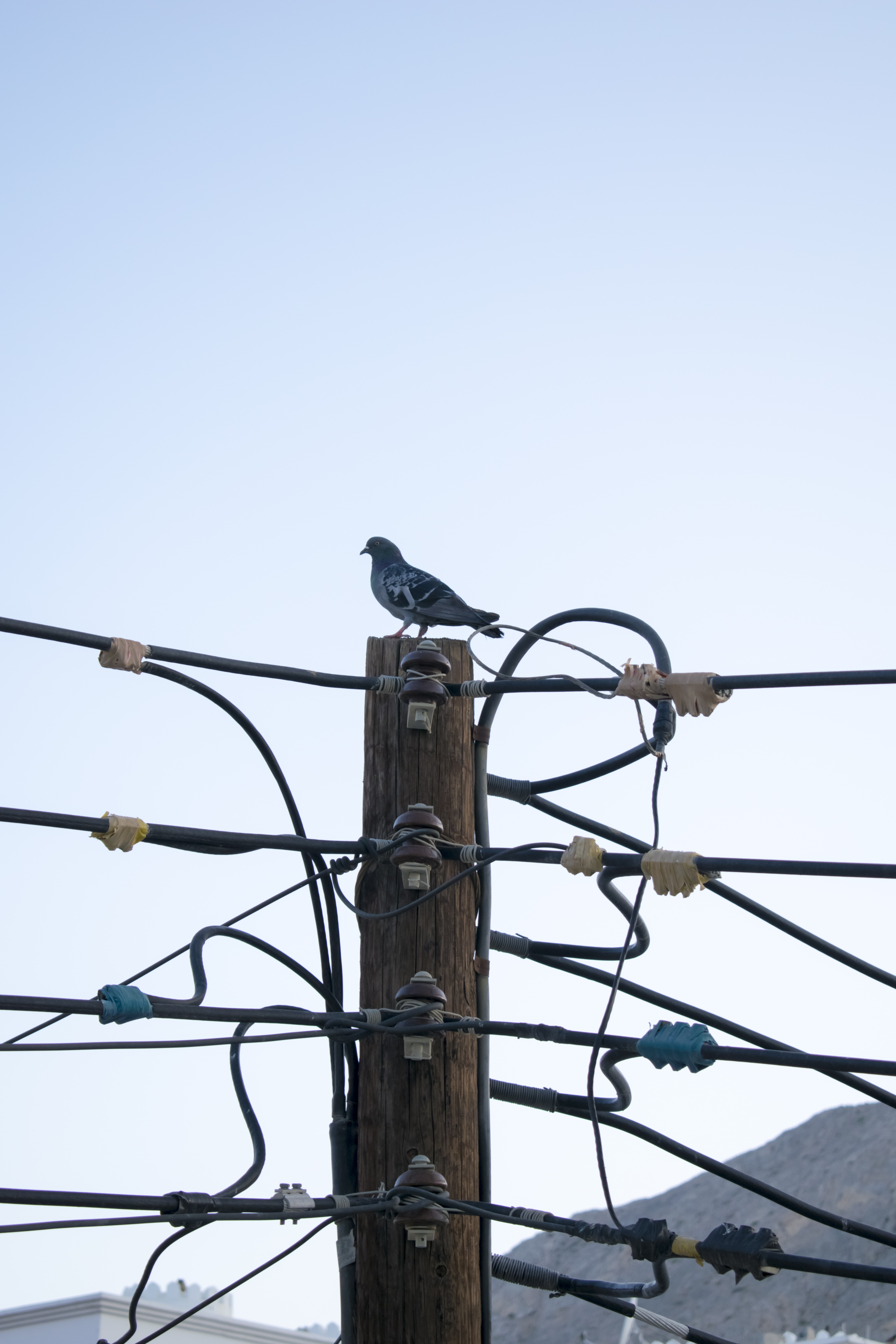 Free image/jpeg, Resolution: 4000x6000, File size: 2.26Mb, a dove on top of an electric pole picture with tags: electric post, wooden post, pigeon, blue sky, bird