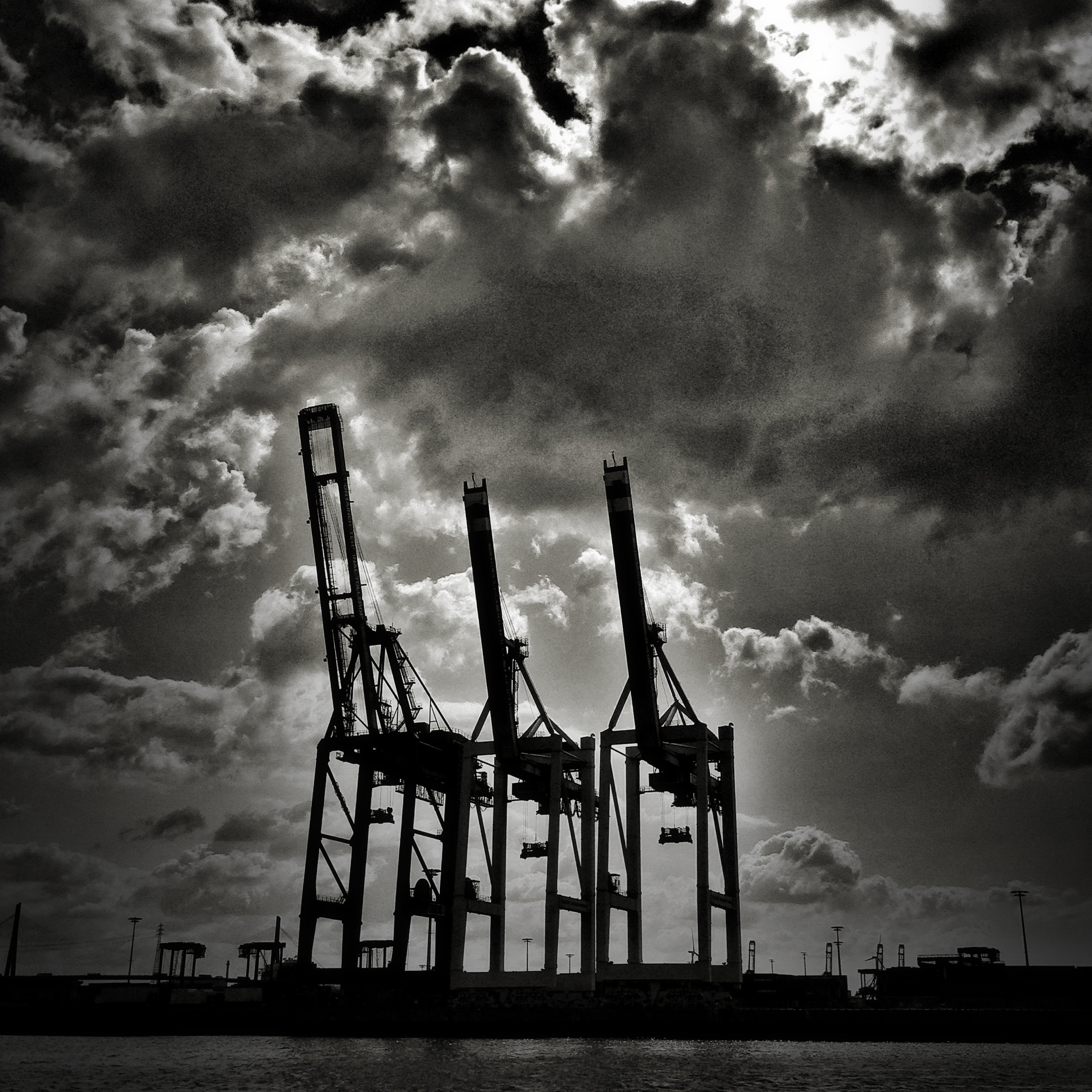 Free image/jpeg, Resolution: 2448x2448, File size: 1.46Mb, monochrome photo of three harbor cranes in Hamburg picture with tags: hamburger, port, germany, boat, water, ship, cargo