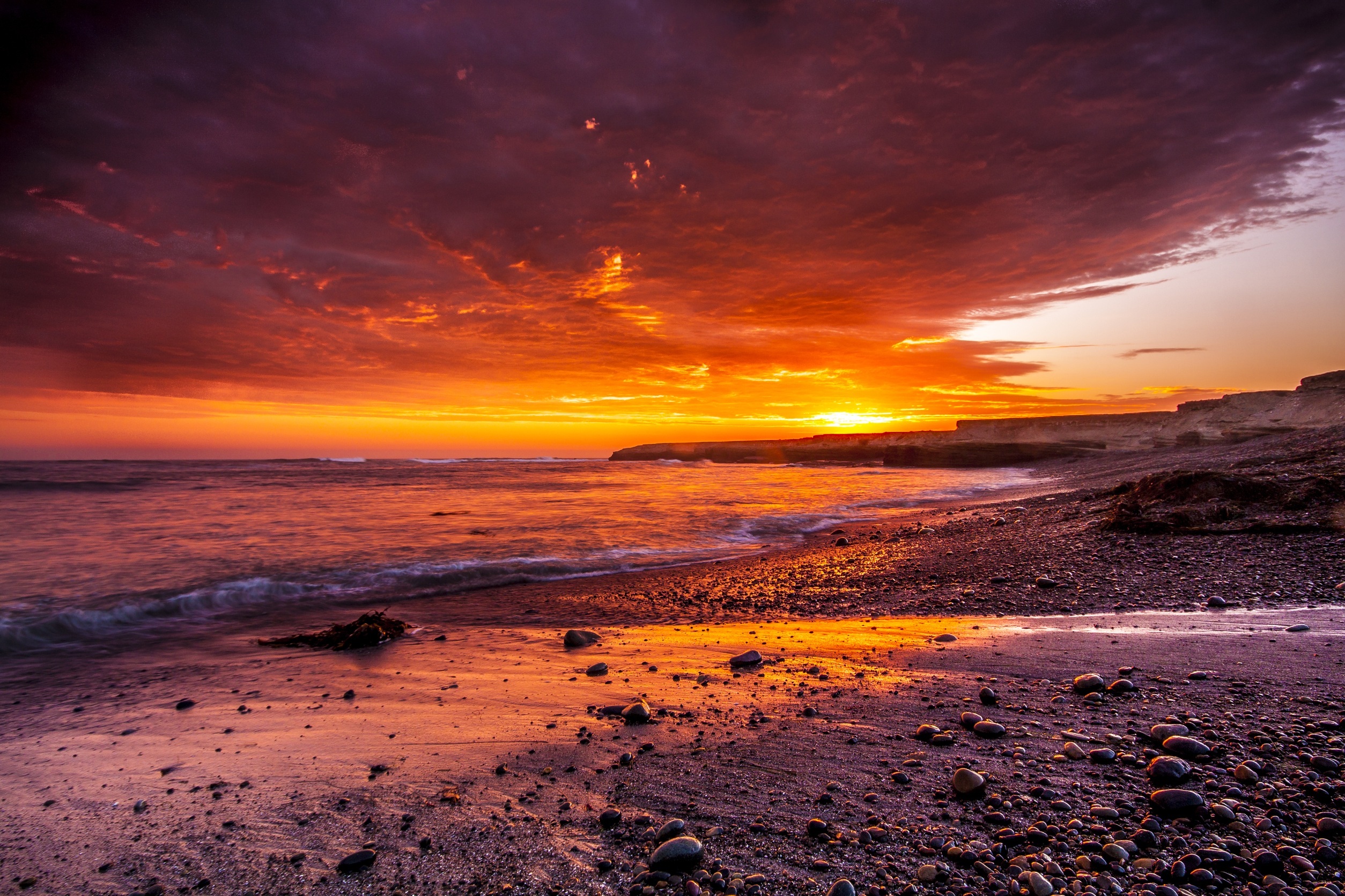 Free image/jpeg, Resolution: 2508x1672, File size: 1.44Mb, Beautiful landscape with the rocky beach of the ocean at colorful, gradient sunset picture with tags: sunset, beach, sand, rocks, ocean, waves, water, beautiful, colorful, gradient