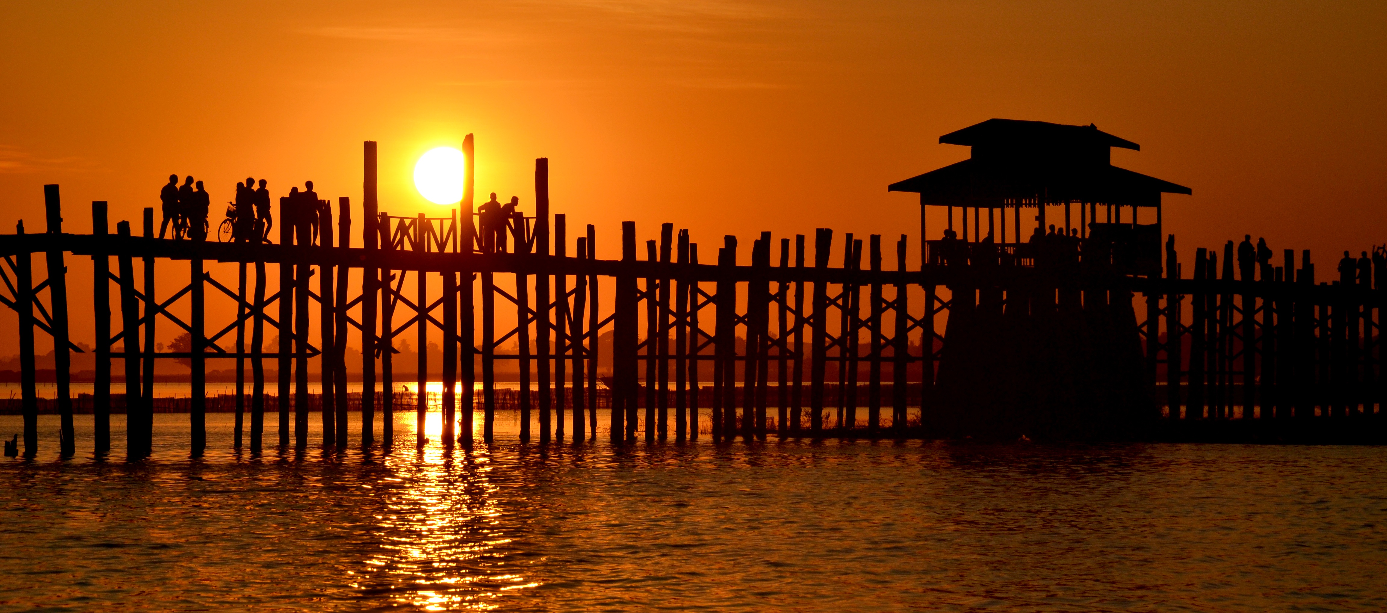 Free image/jpeg, Resolution: 4608x2037, File size: 2Mb, U-Bein Bridge Mandalay Myanmar picture with tags: u-bein bridge, mandalay, myanmar, sunset, red, black