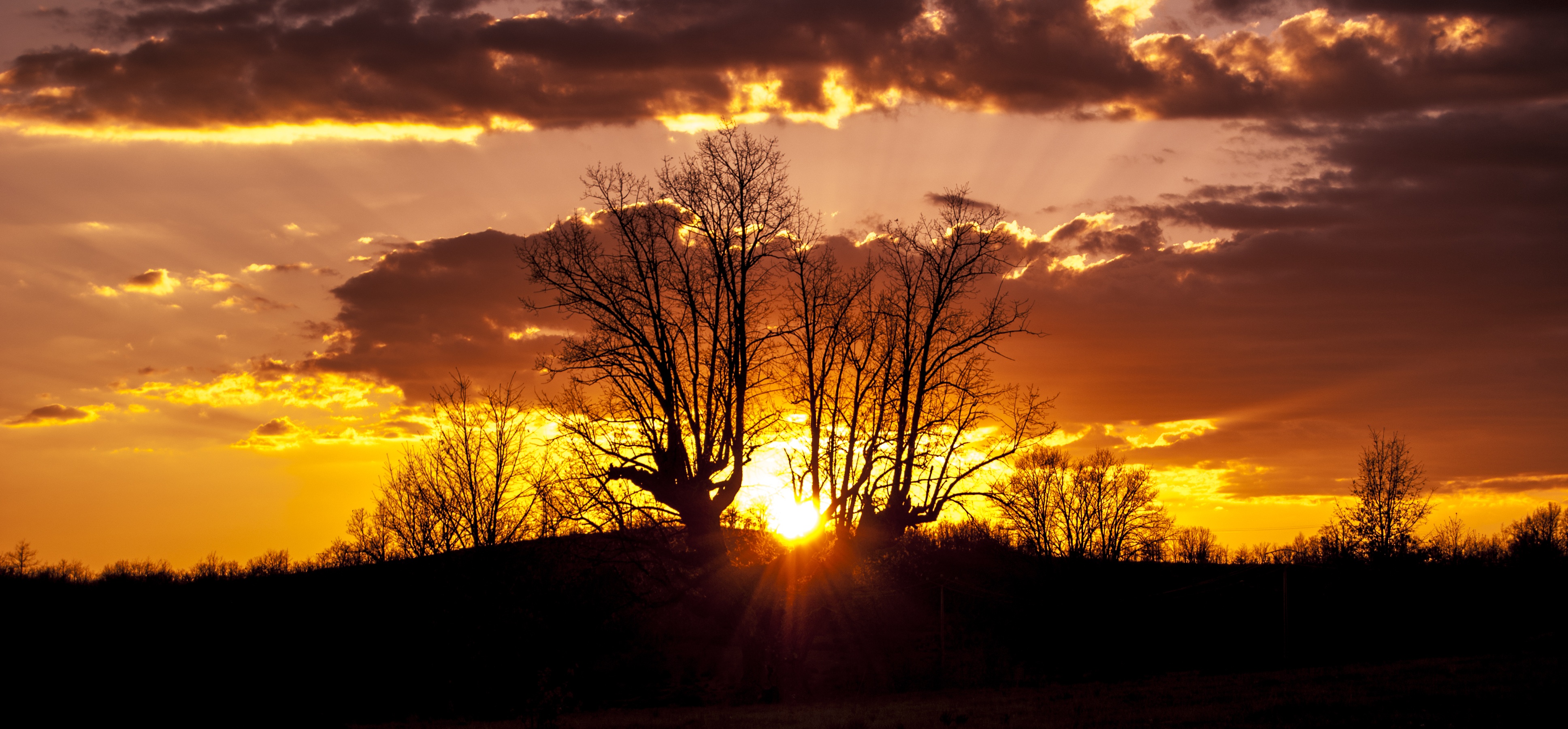 Free image/jpeg, Resolution: 3872x1800, File size: 1.58Mb, sun sets behind two trees picture with tags: sunset, nature, landscape, clouds, sun, sky, tree, silhouette