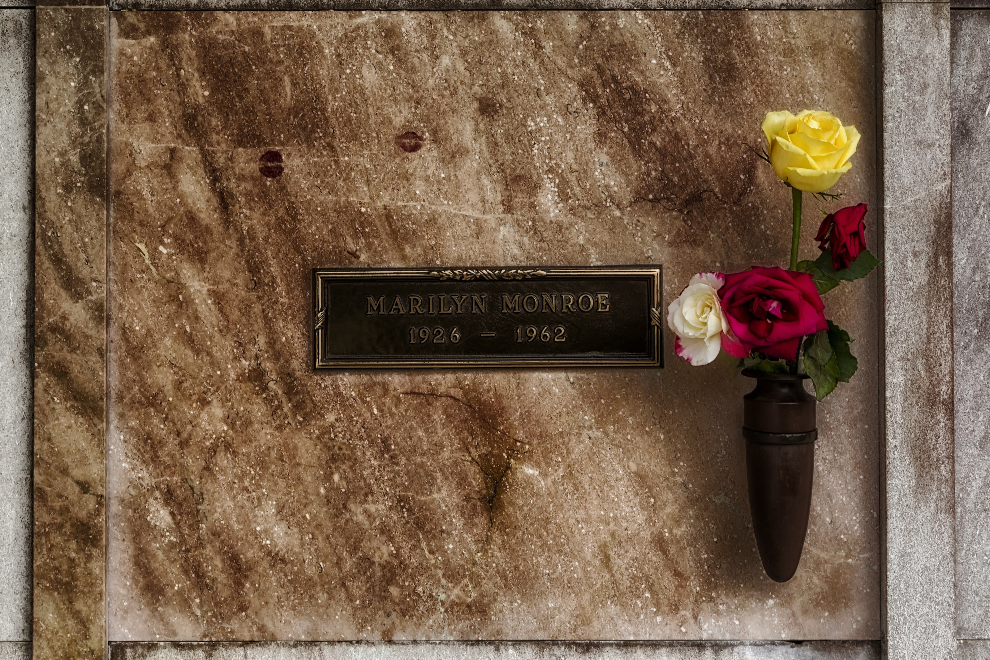 Free image/jpeg, Resolution: 3200x2134, File size: 2.19Mb, Crypt of Marilyn Monroe, with the colorful flowers picture with tags: marilyn monroe, star, resting place, flowers, crypt, close-up, sign, colorful