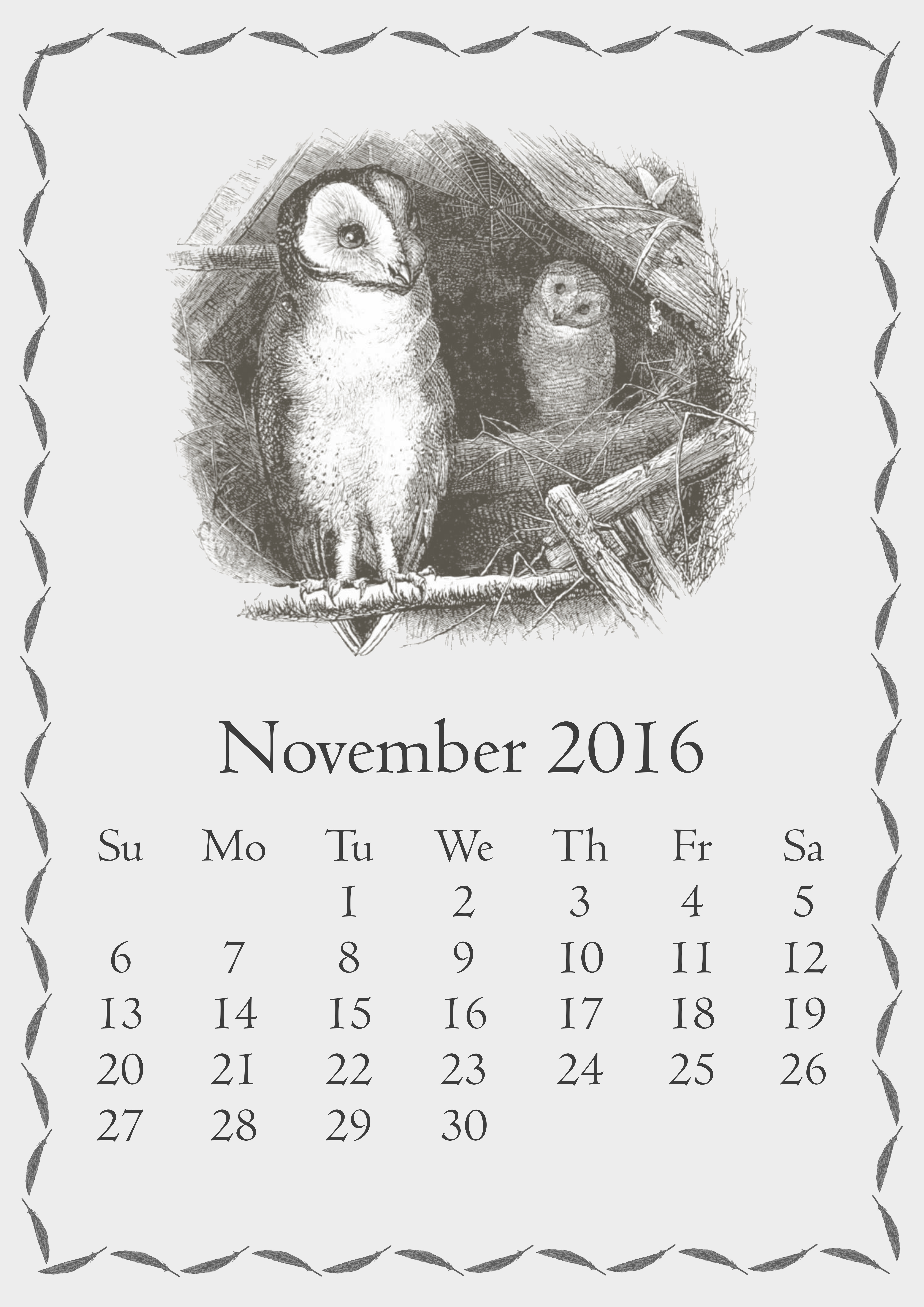 Free image/jpeg, Resolution: 5787x8185, File size: 3.47Mb, november 2016 calendar drawing picture with tags: november, calendar, month, owl, bird, vintage, autumn, 2016