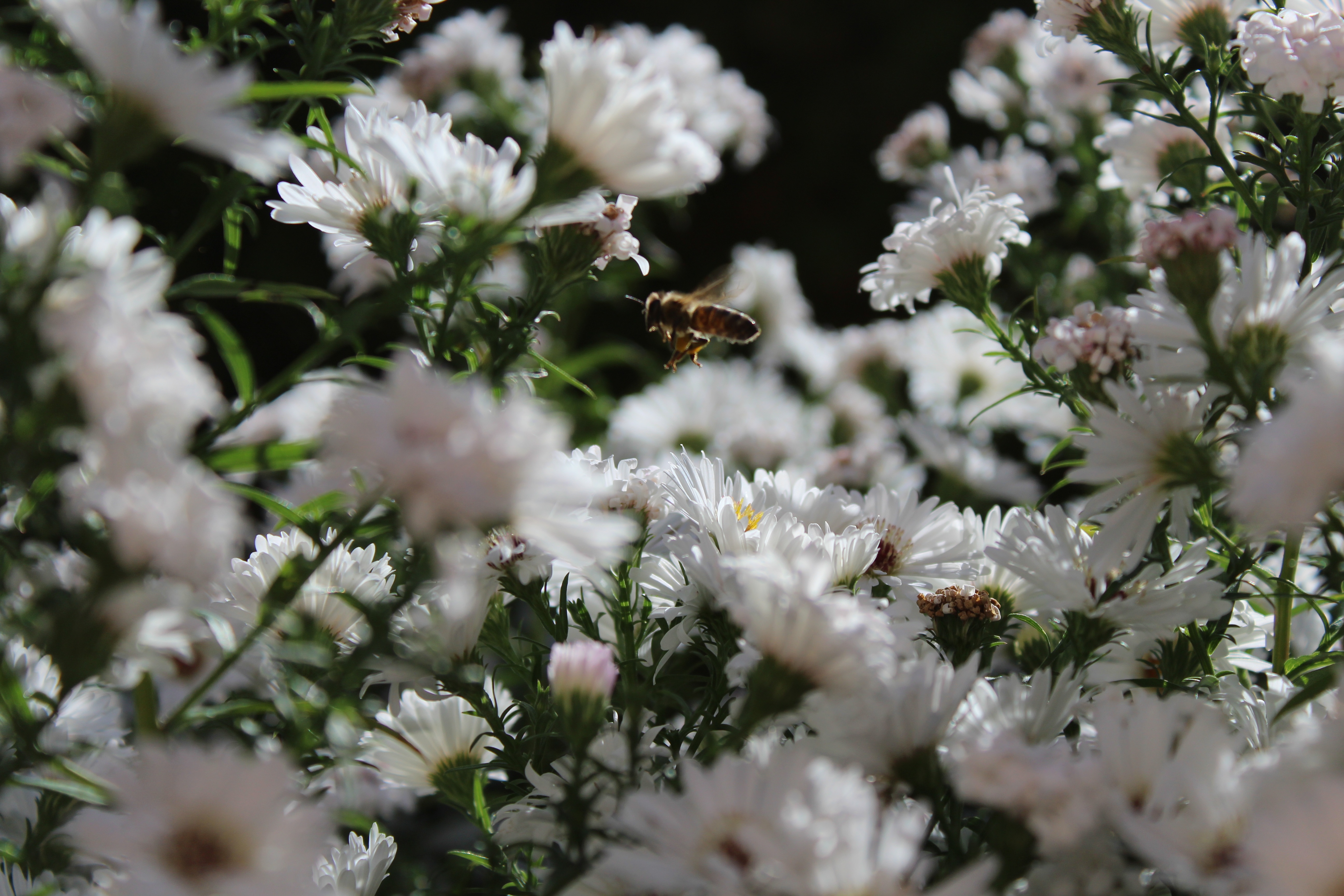 Free image/jpeg, Resolution: 5184x3456, File size: 3.02Mb, insect among white inflorescences close up picture with tags: bee, insect, plant, white flowers, close up, nature, summer, blur