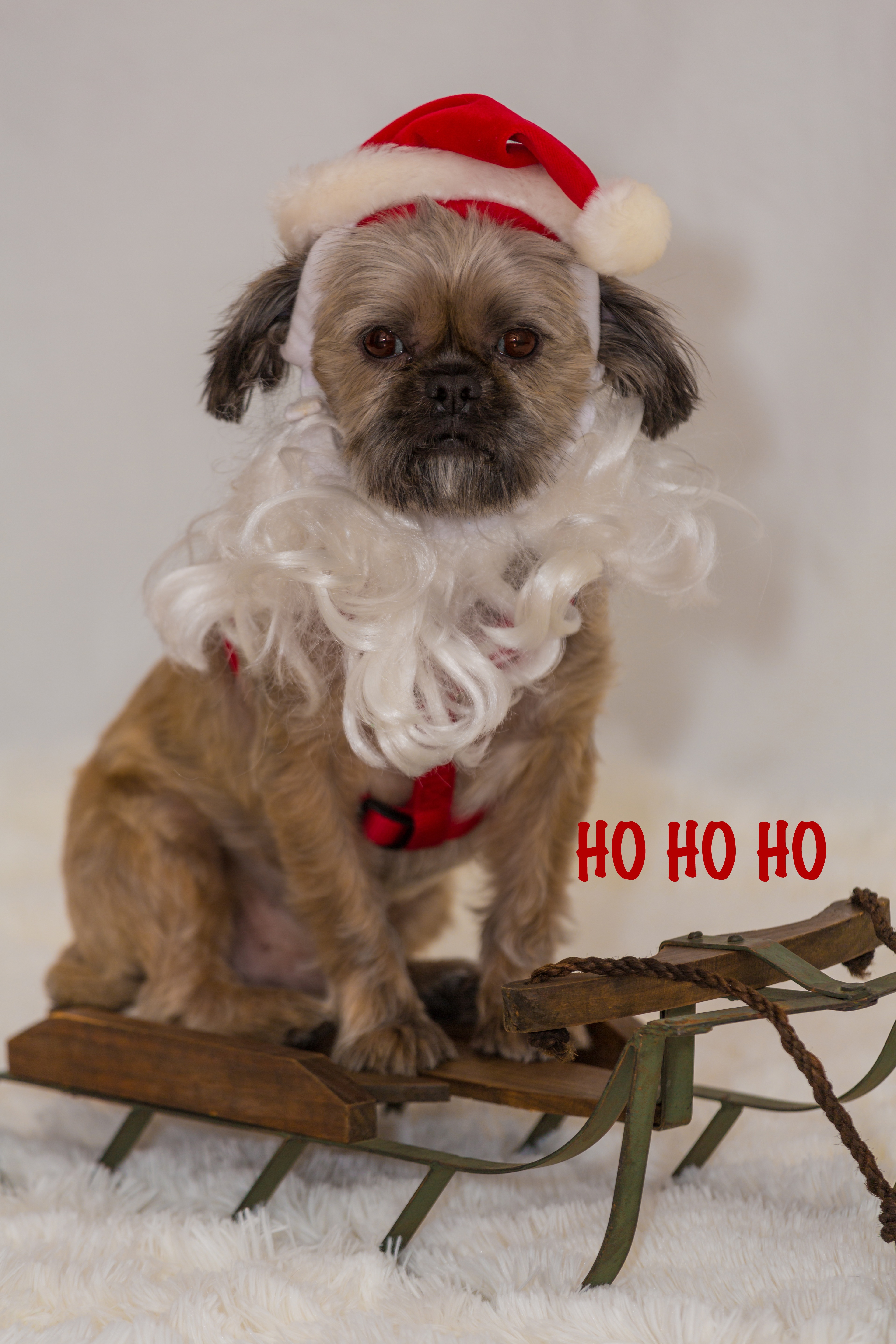 Free image/jpeg, Resolution: 3840x5760, File size: 3.21Mb, dog dressed as Santa Claus on a sleigh picture with tags: animal, pet, dog, hat, costume