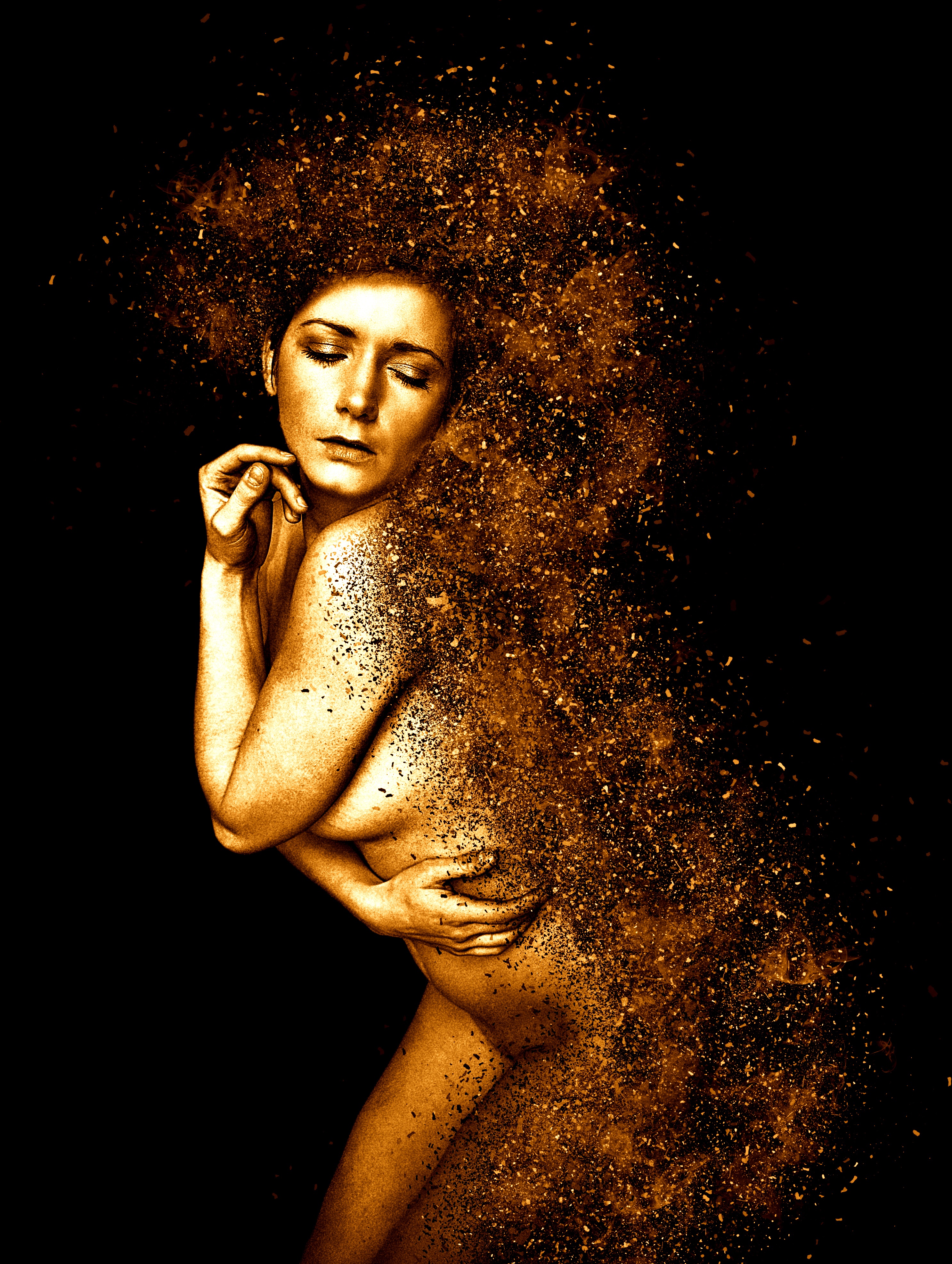 Free image/jpeg, Resolution: 2973x3946, File size: , Portrait of an elegant girl in gold effect picture with tags: woman, movement, portrait, move, dance, female, pose, silhouette, ease, sporty, elegance, body, skin