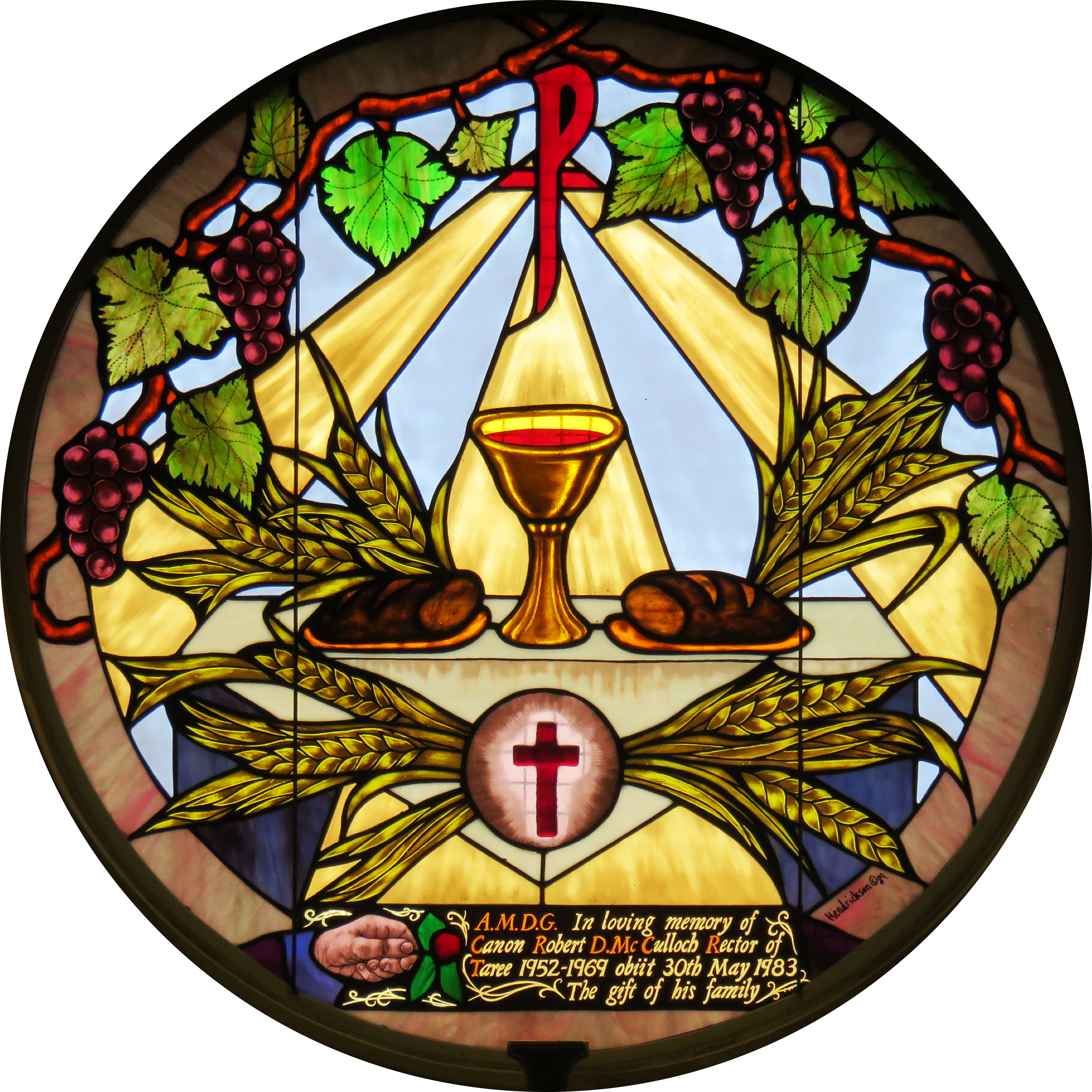 Stained glass with an eucharist drawing in a church
