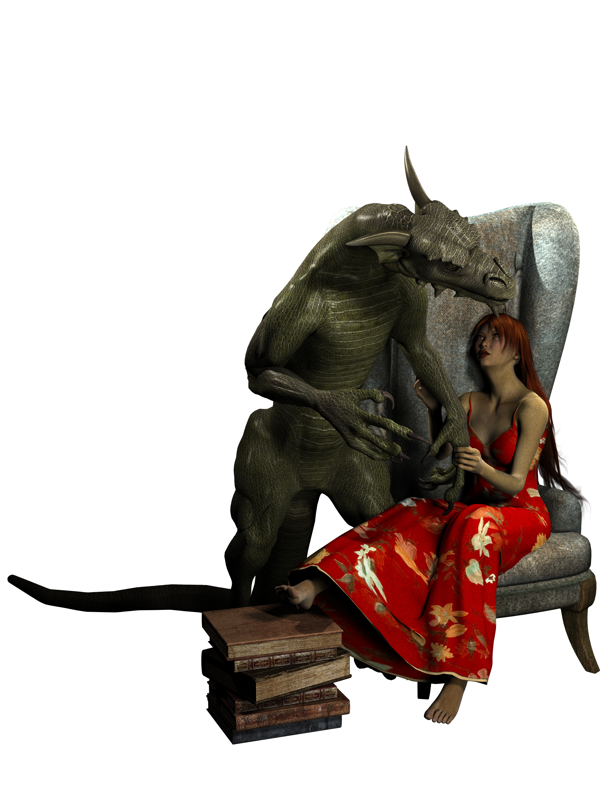 Free image/png, Resolution: 2000x2588, File size: 3.72Mb, mystical image of a girl in a red dress sitting on an armchair and a dragon picture with tags: dragon, books, lady, chair, story, animal, fairy, design, tale