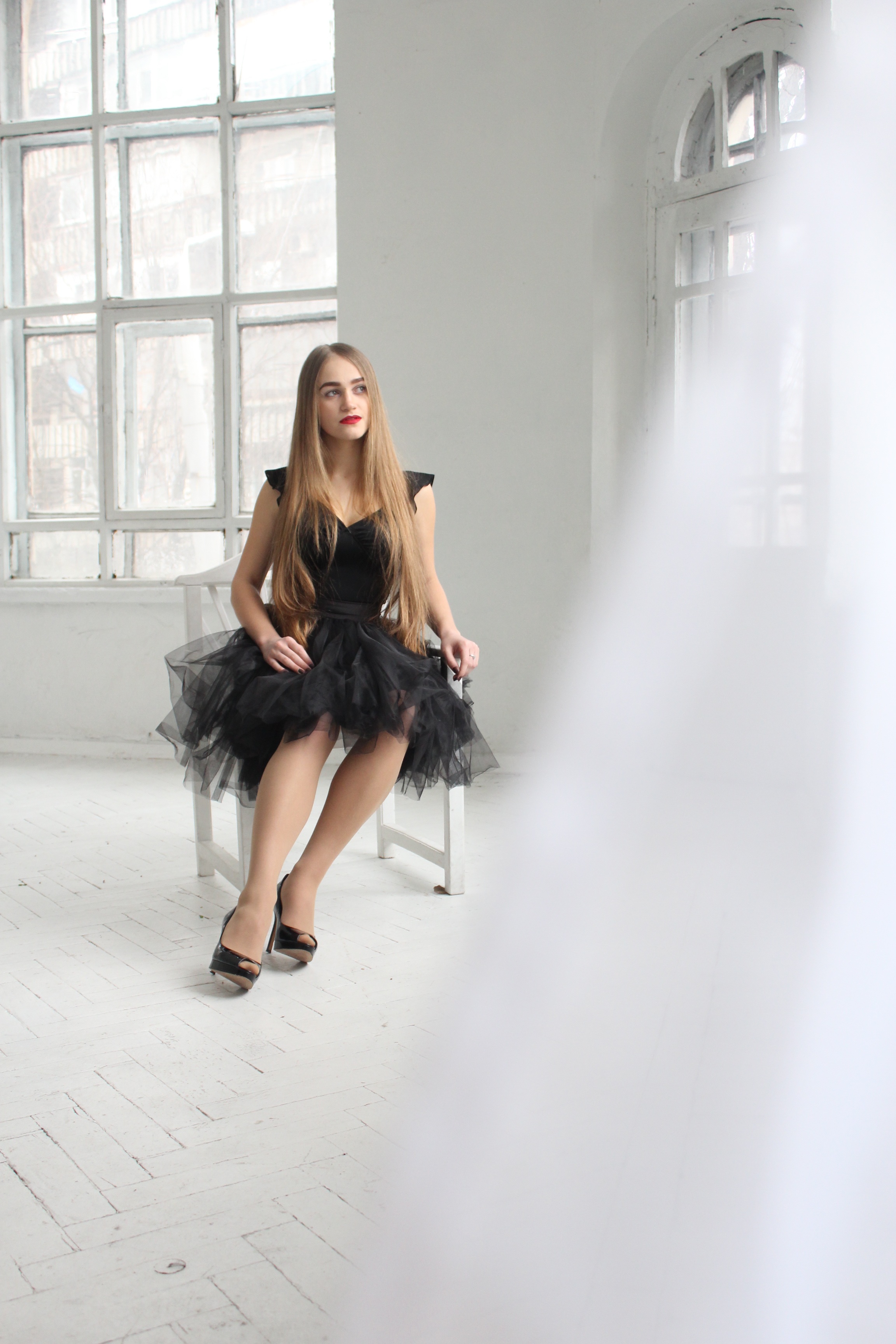 Free image/jpeg, Resolution: 2304x3456, File size: 1.17Mb, charming Girl White Hall picture with tags: girl, white hall, thoughtfulness, black, dress