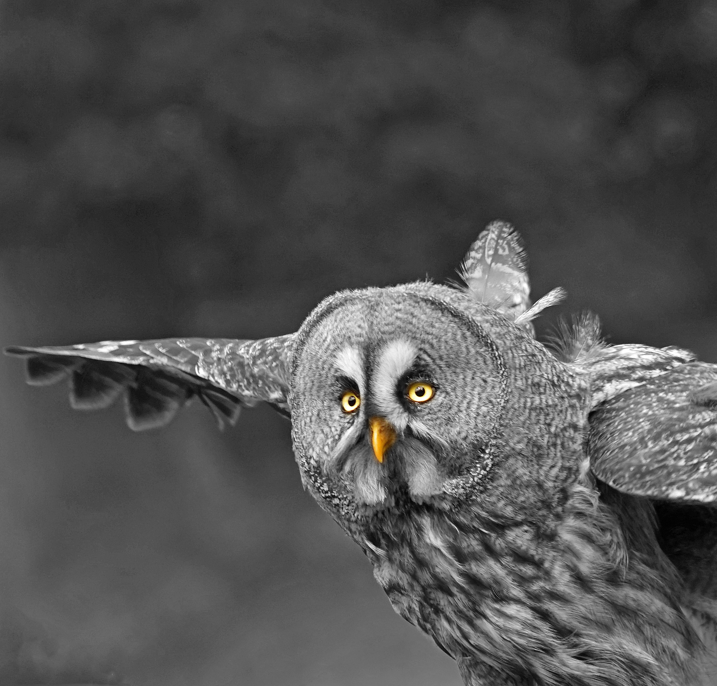 Free image/jpeg, Resolution: 2294x2197, File size: 1.62Mb, A gray owl flies through the air picture with tags: owl, flight, plumage, bill, raptor, hunter