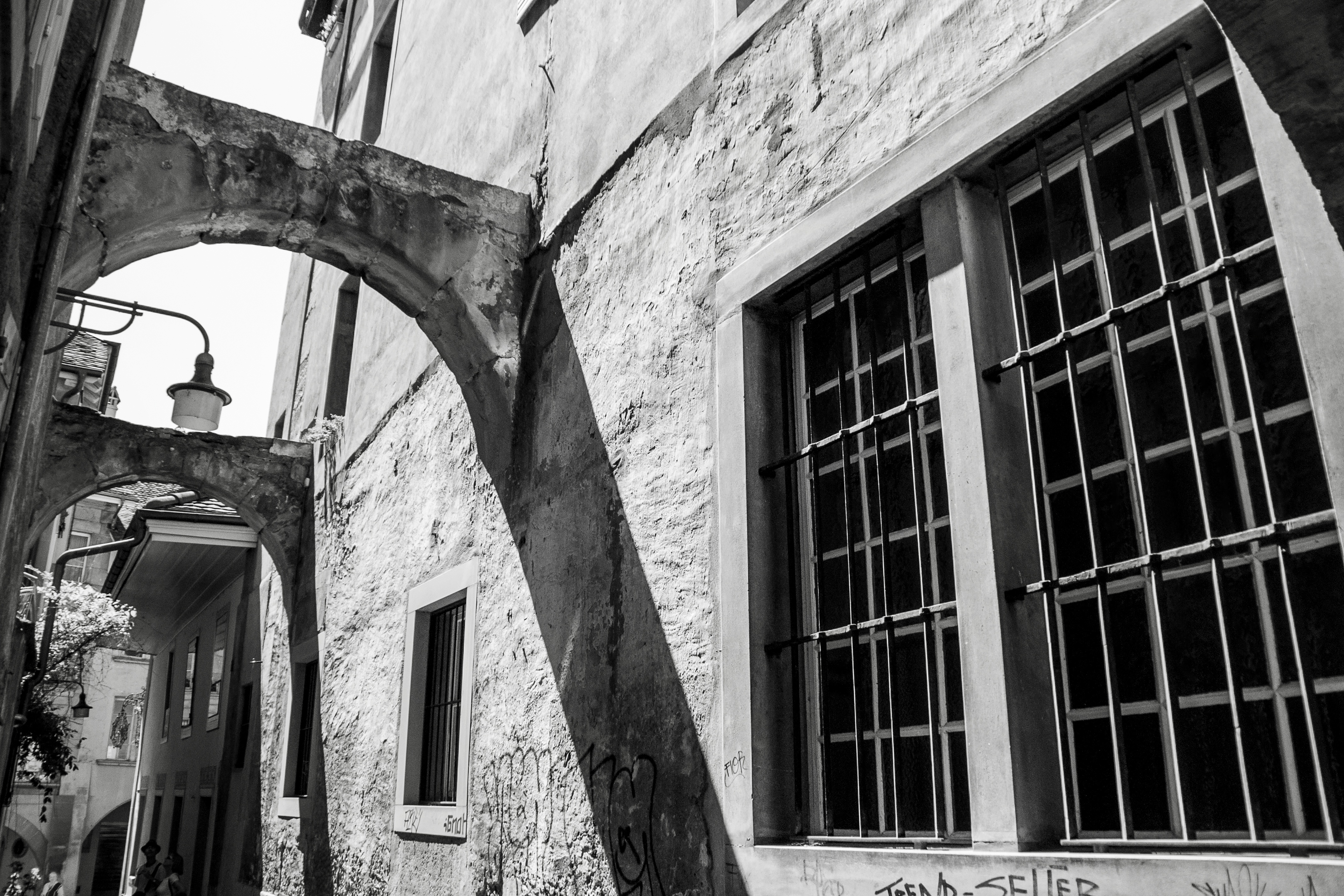 Free image/jpeg, Resolution: 4272x2848, File size: 4.43Mb, Building Concrete Wall black and white picture with tags: building, wall, window, sill bars, arches