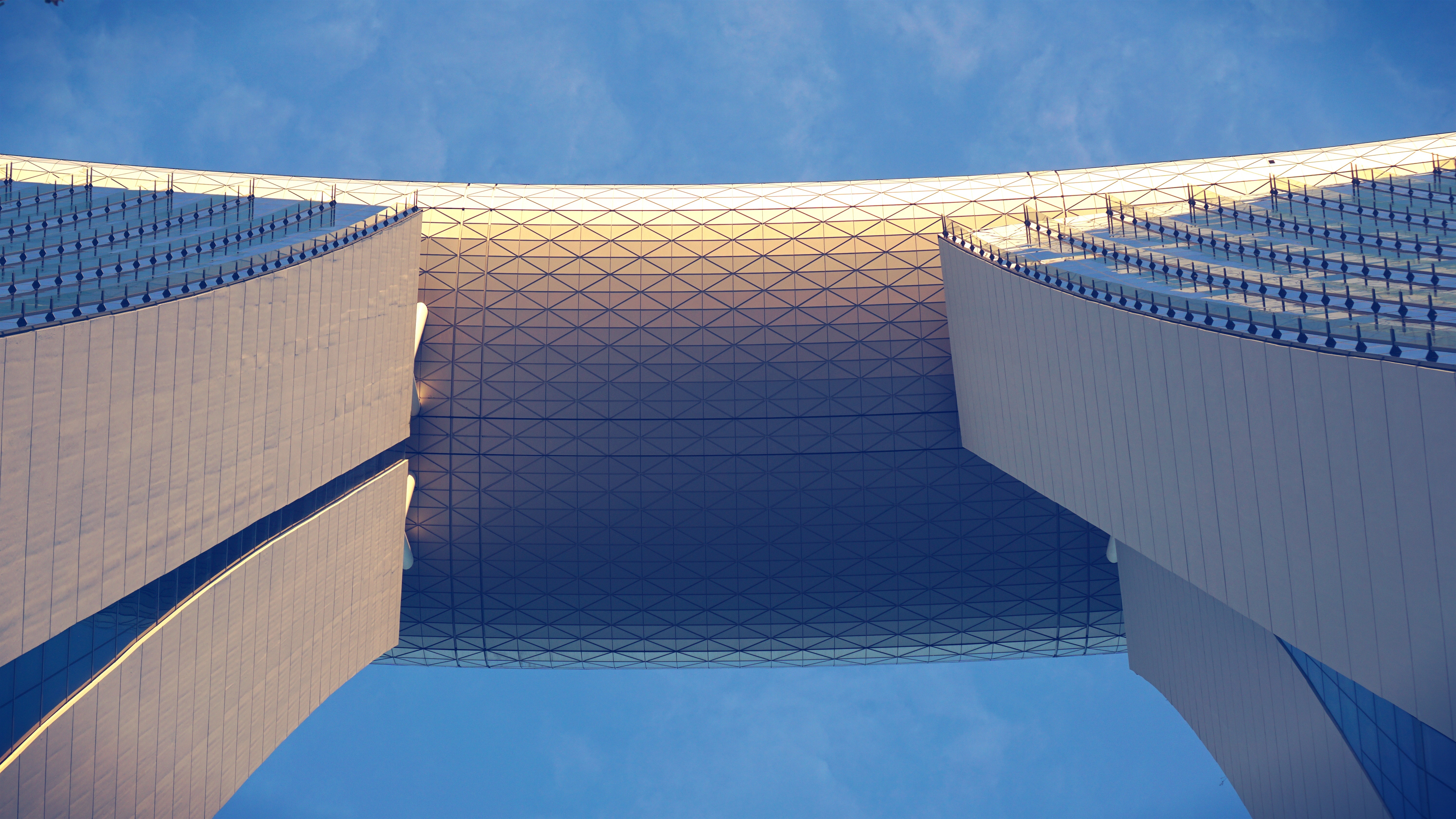Free image/jpeg, Resolution: 6000x3376, File size: 5.57Mb, Low angle shot of the shiny building in colorful light, under the blue sky with clouds picture with tags: architecture, building, infrastructure, low angle shot, shiny, colorful, light, blue sky, clouds