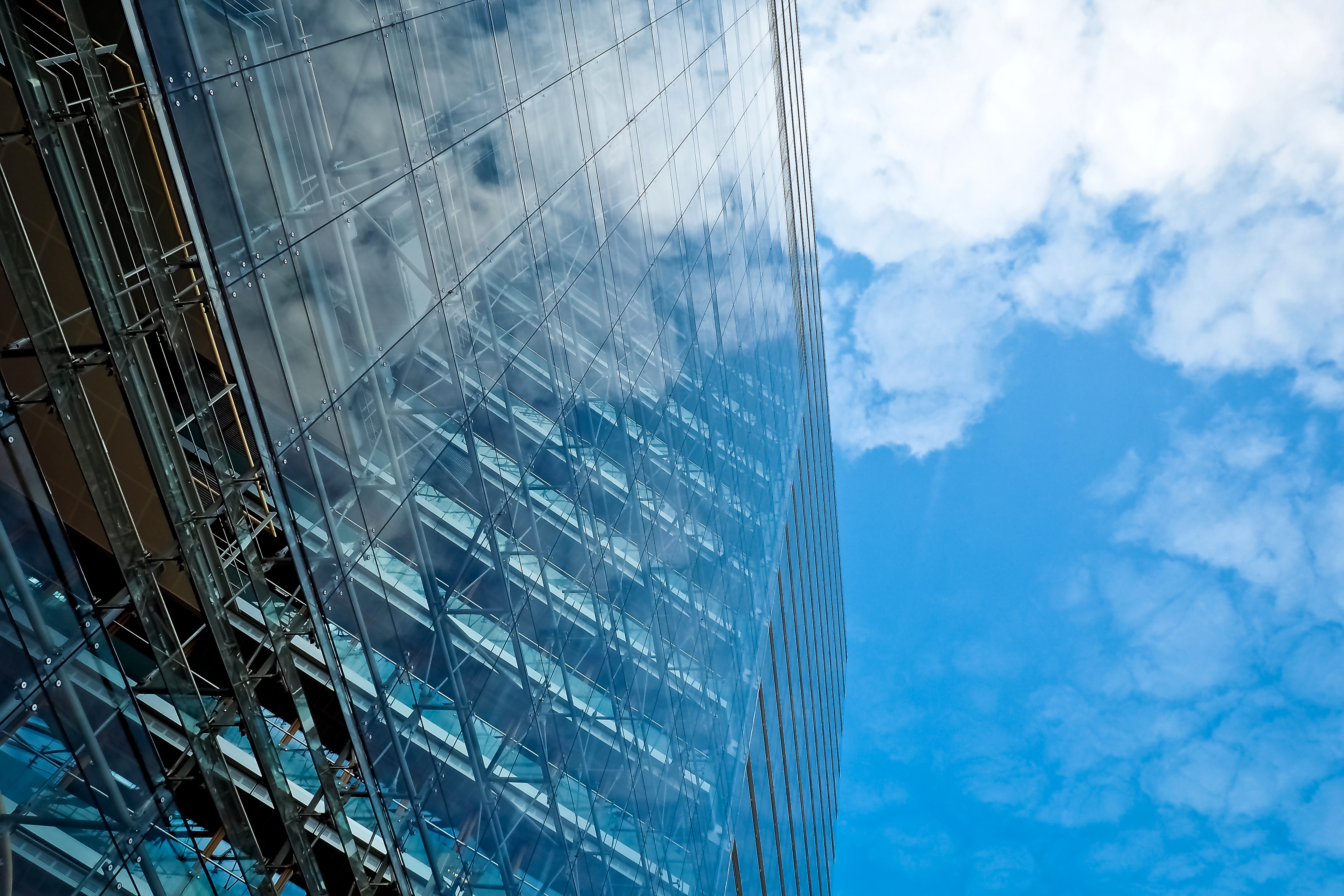 Low angle shot of the shiny glass building in düsseldorf, germany, under the blue sky with white clouds
