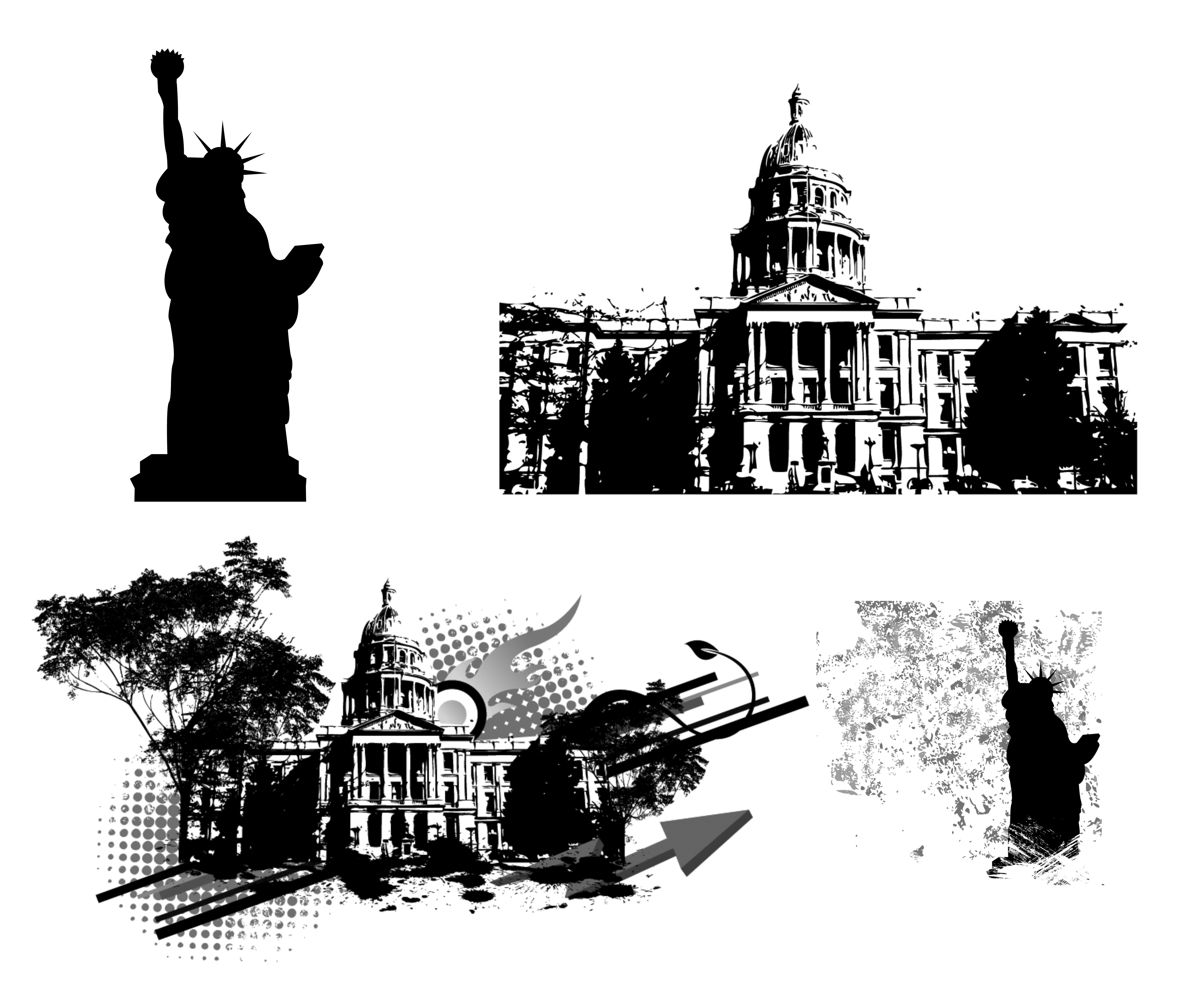 Free image/png, Resolution: 6000x5100, File size: , Black and white drawings of the Statue of Liberty and White House, clipart picture with tags: usa, statue of liberty, white house, black and white, buildings, washington dc, silhouettes, drawings, clipart