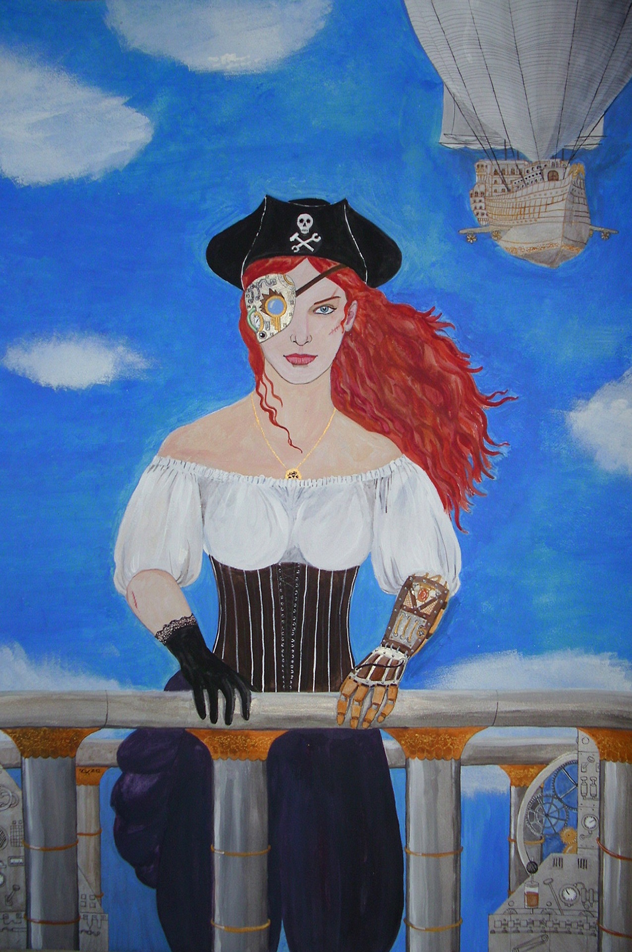 Free image/jpeg, Resolution: 1275x1920, File size: 689.64Kb, steampunk airship pirate woman illustration picture with tags: steampunk, airship, pirate, captain, aircraft, clouds, lady, fantasy