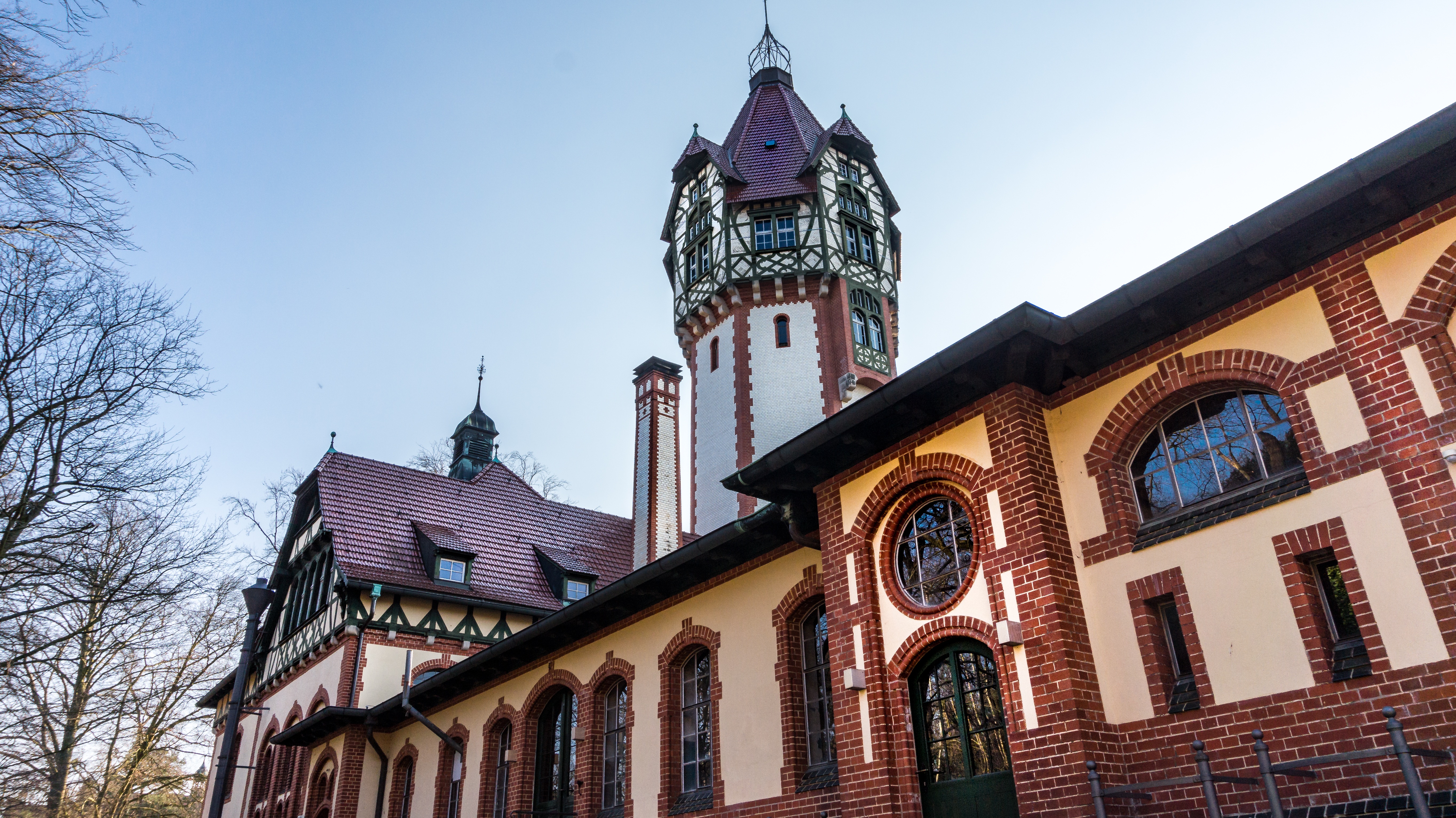 Free image/jpeg, Resolution: 5456x3064, File size: , brick Old House tower picture with tags: architecture, old, house, brick, tower, window, facade, truss