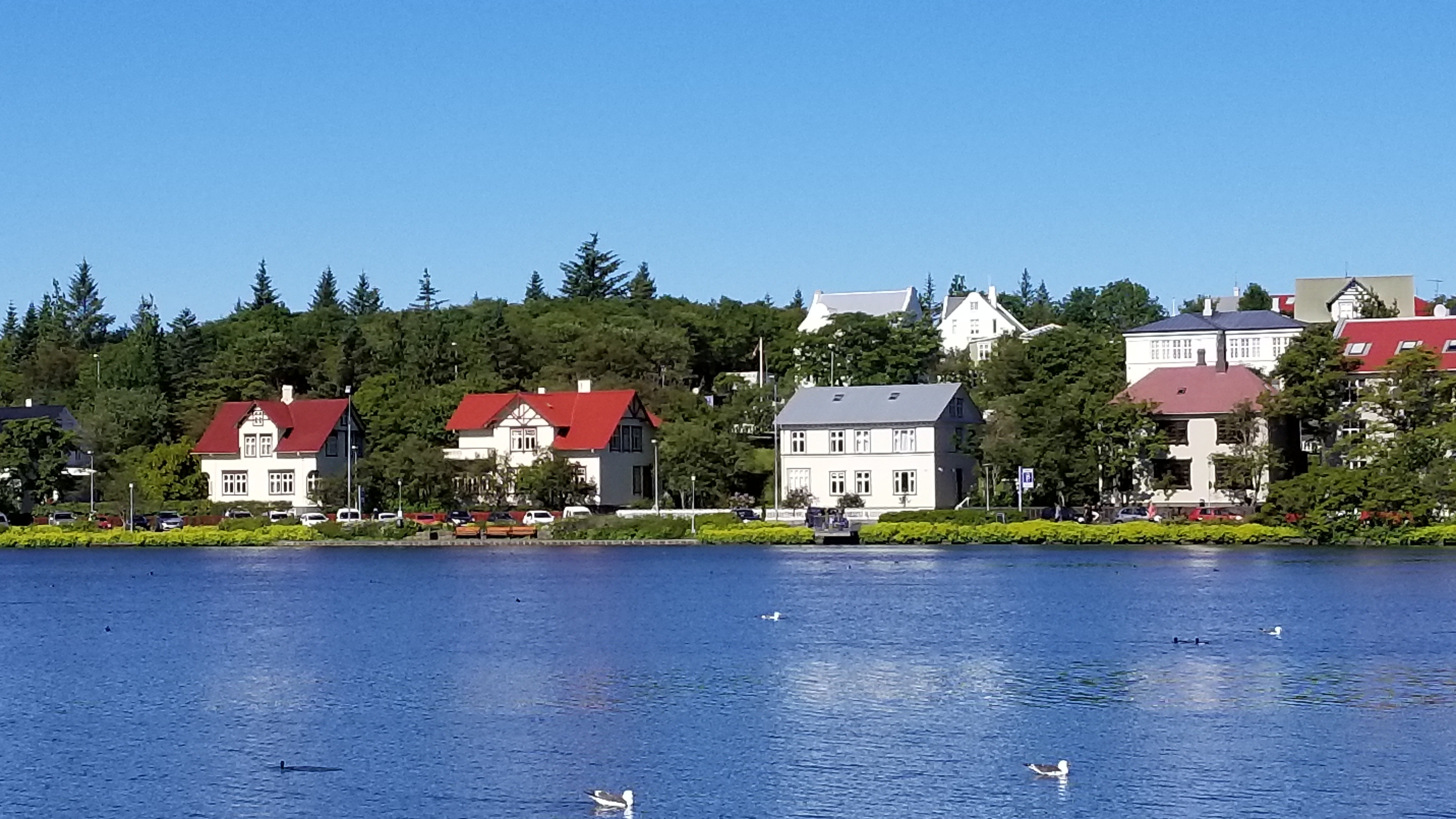 Free image/jpeg, Resolution: 4032x2268, File size: , lakeside houses in Iceland picture with tags: water, house, iceland, summer, outdoors, lakeside, blue sky
