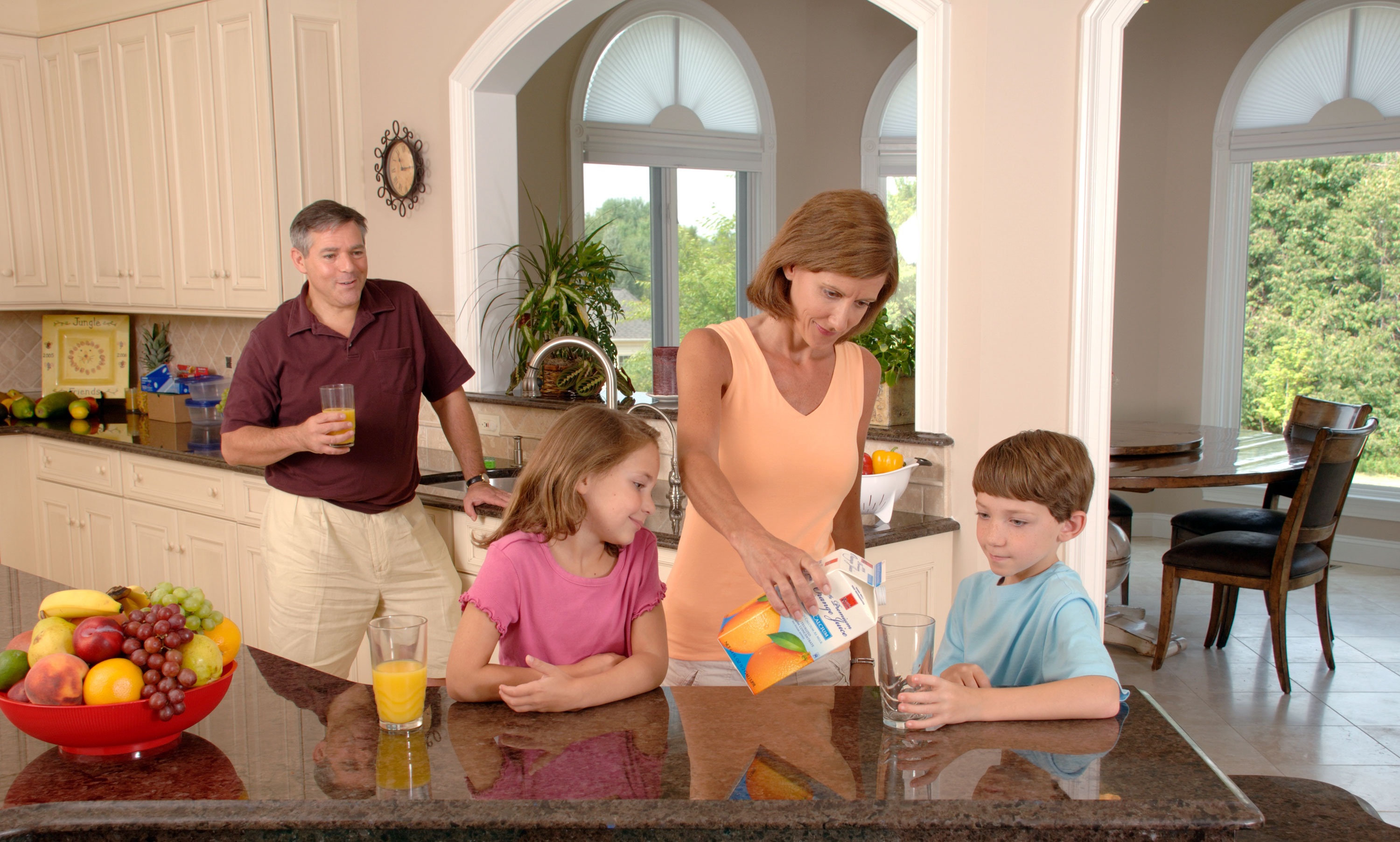 Free image/jpeg, Resolution: 3000x1806, File size: 897Kb, happy family drinking orange juice at home picture with tags: family drinking orange juice, healthy, home, children, father, mother, kitchen