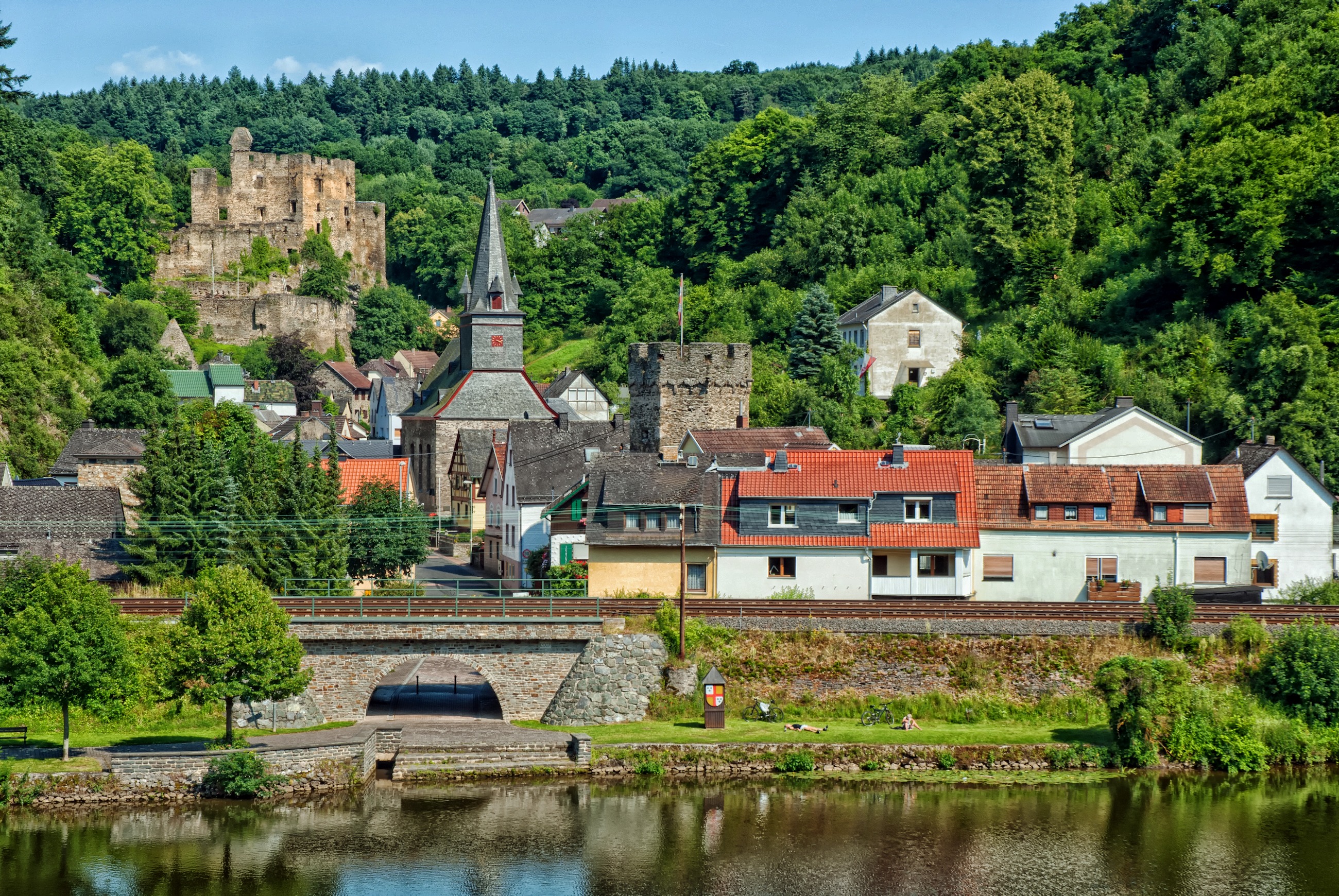 Free image/jpeg, Resolution: 2600x1740, File size: 1.89Mb, church in old town and castle on forested mountain side at coast, germany, balduinstein picture with tags: balduinstein, germany, town, urban, river, reflections