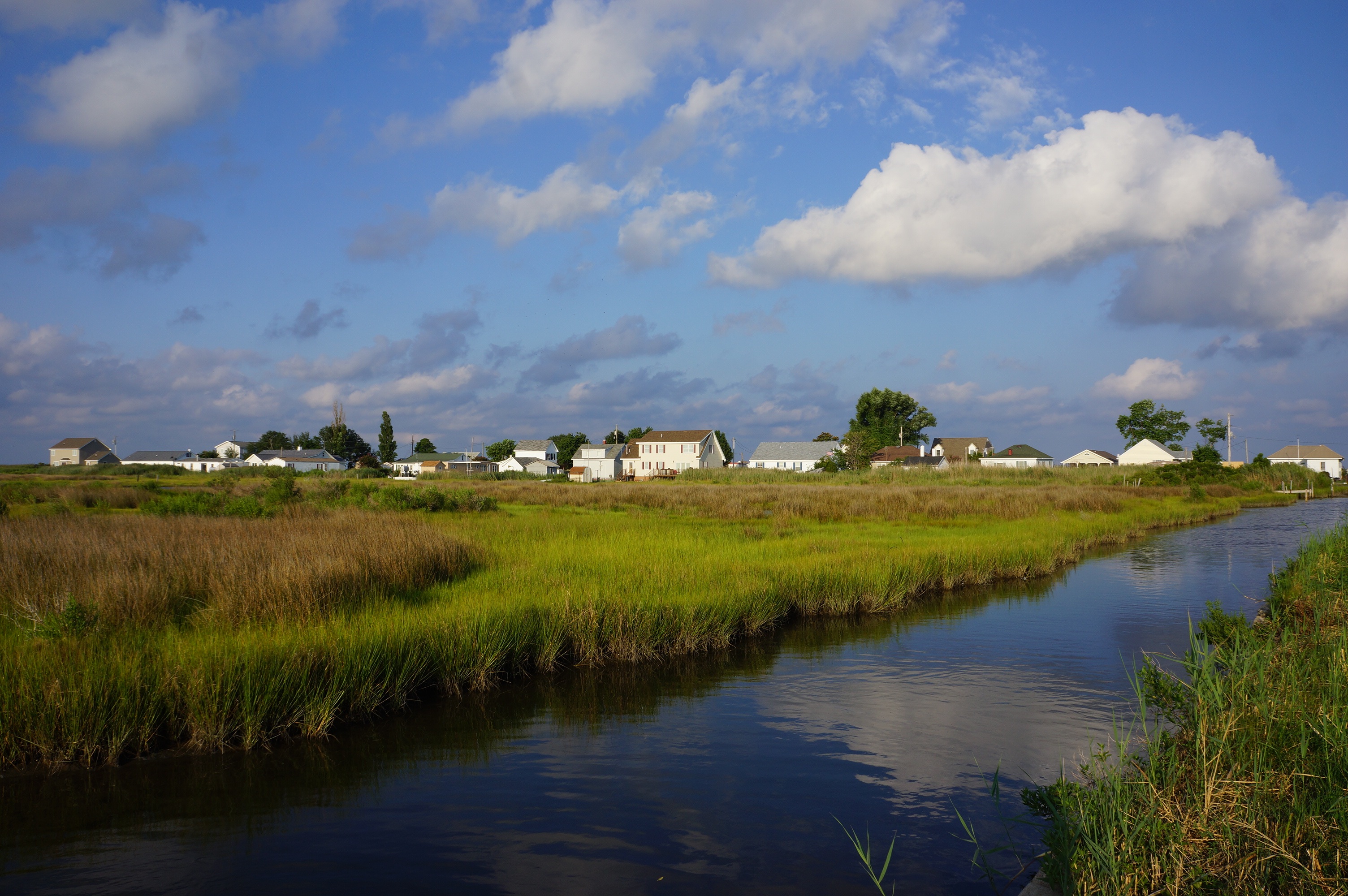 Free image/jpeg, Resolution: 3008x2000, File size: 1.56Mb, marshland at channel and distant village, rural summer landscape picture with tags: river, town, grass, marshland, clouds, reflection