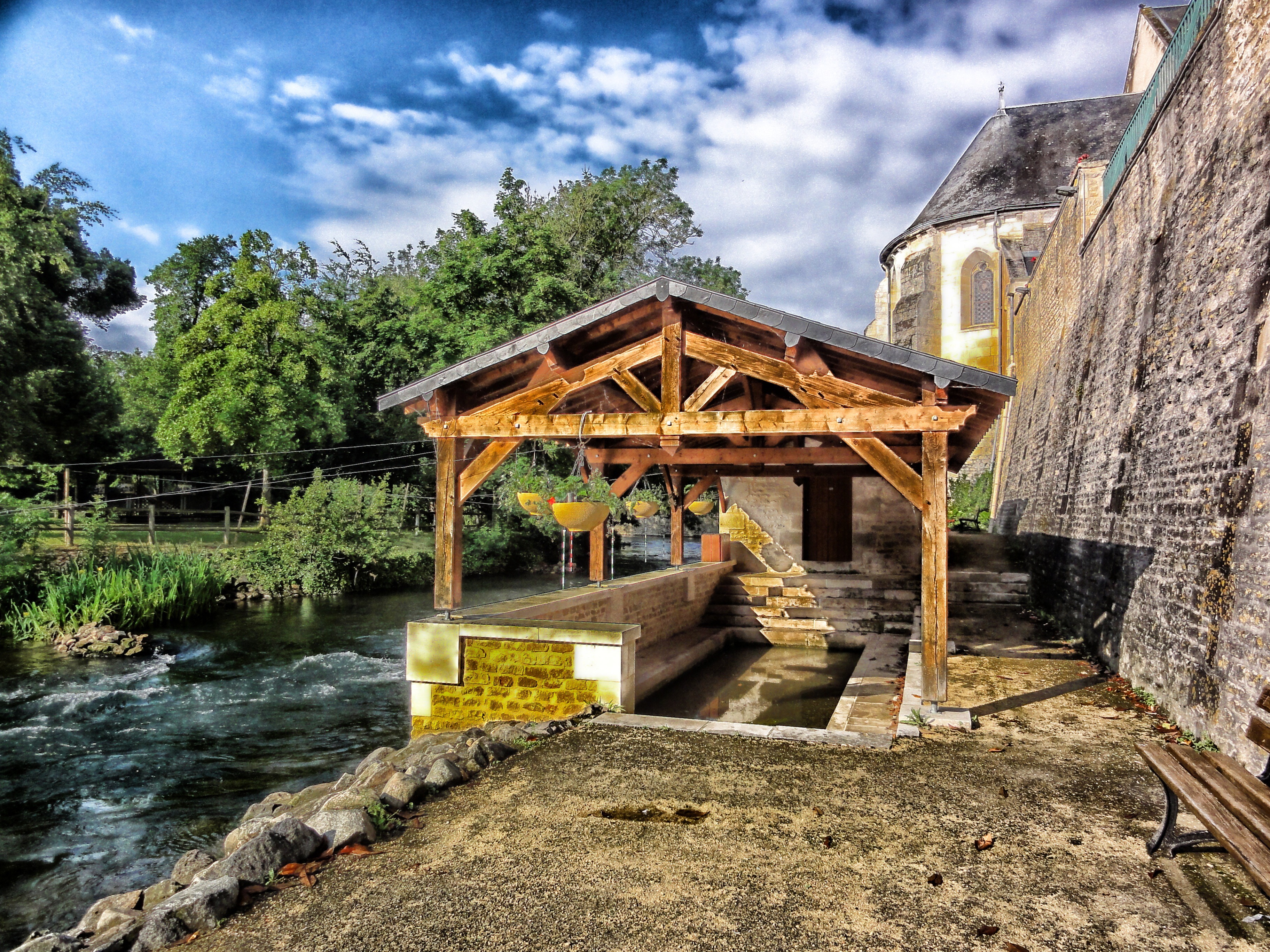 Free image/jpeg, Resolution: 3648x2736, File size: 3.68Mb, shed at water beside old stone wall, france picture with tags: france, river, stream, water, forest, trees, nature
