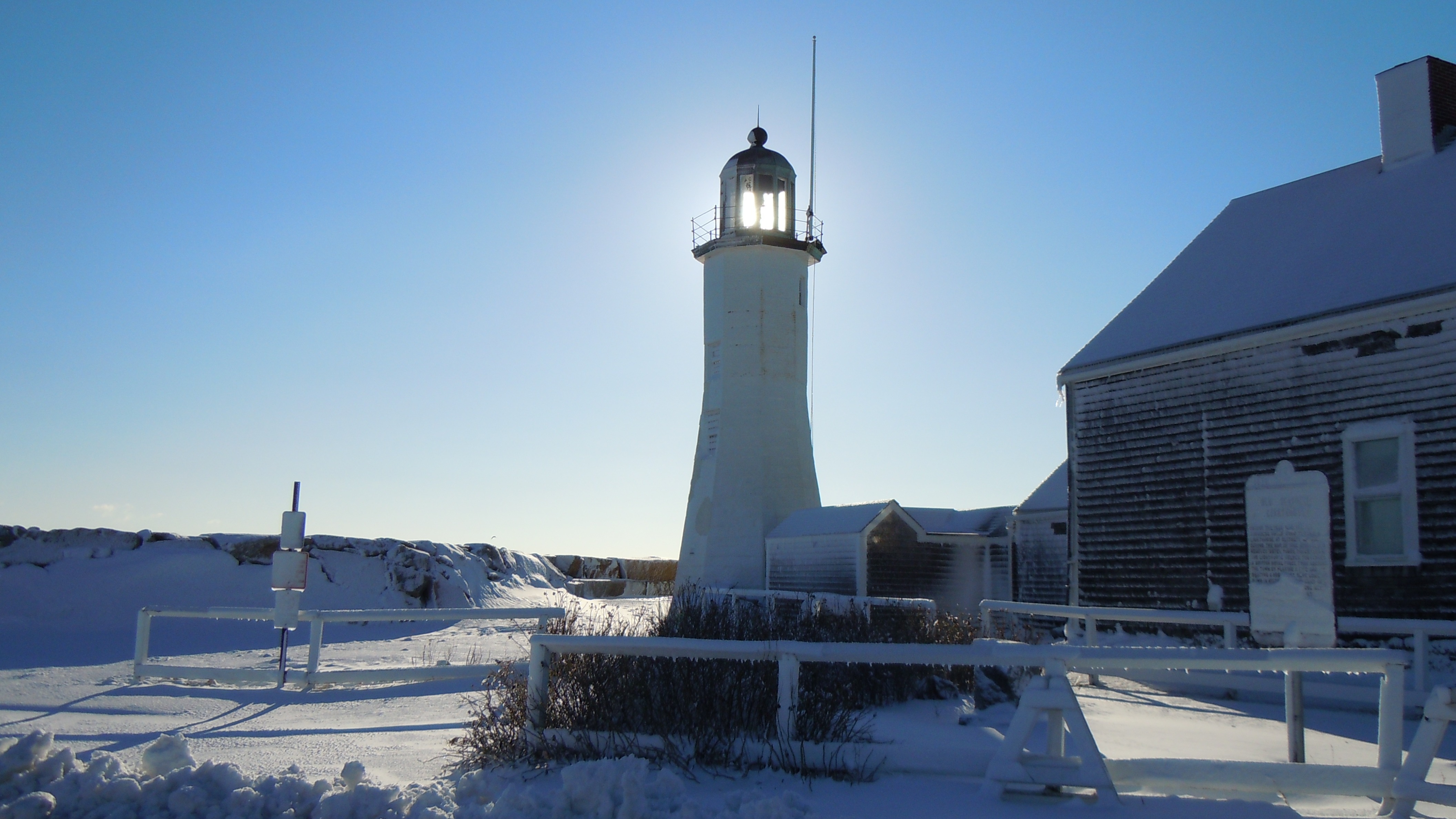 Free image/jpeg, Resolution: 4224x2376, File size: 1.33Mb, white lighthouse on snow at blue sky picture with tags: snow, blue sky, lighthouse, winter